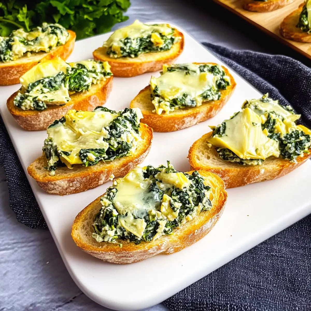 As I sipped my coffee on a chilly afternoon, my thoughts danced around my favorite party bites, landing firmly on the crunchy delight of Creamy Baked Spinach Artichoke Crostini. Perfect for gatherings or simply indulging on a cozy night, this appetizer seamlessly blends crispy baguette with a rich and cheesy spinach-artichoke spread. What’s more, it takes a mere 15 minutes to whip up, making it one of the quickest crowd-pleasers in my repertoire. With its tantalizing flavor and creamy goodness, you’ll be hard-pressed to resist going back for seconds! Ready to impress your friends while keeping things effortless? Let’s dive into making these irresistible crostini!