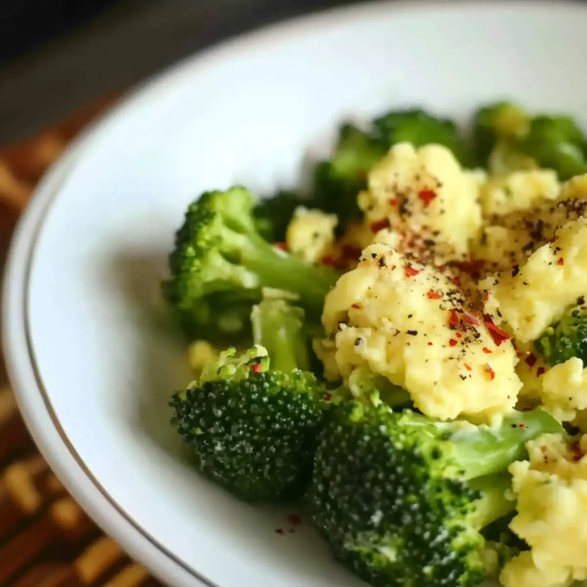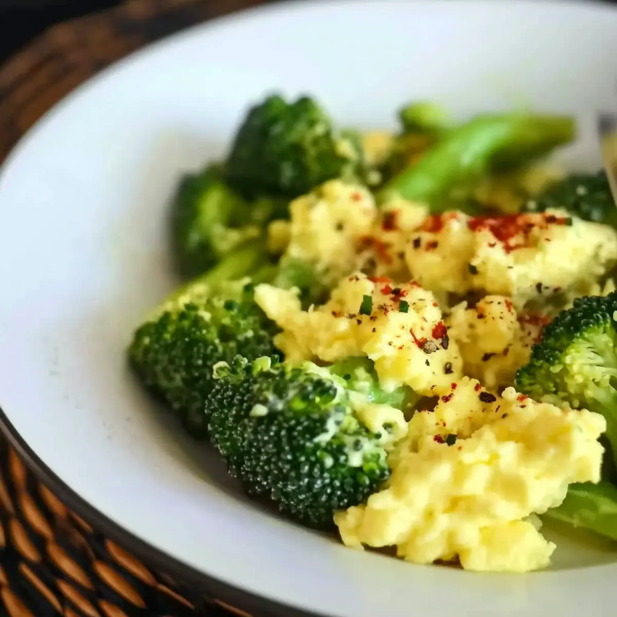 Flavor-packed goodness: The combination of fresh broccoli and creamy scrambled eggs creates a satisfying meal, enhanced by a hint of red pepper flakes.