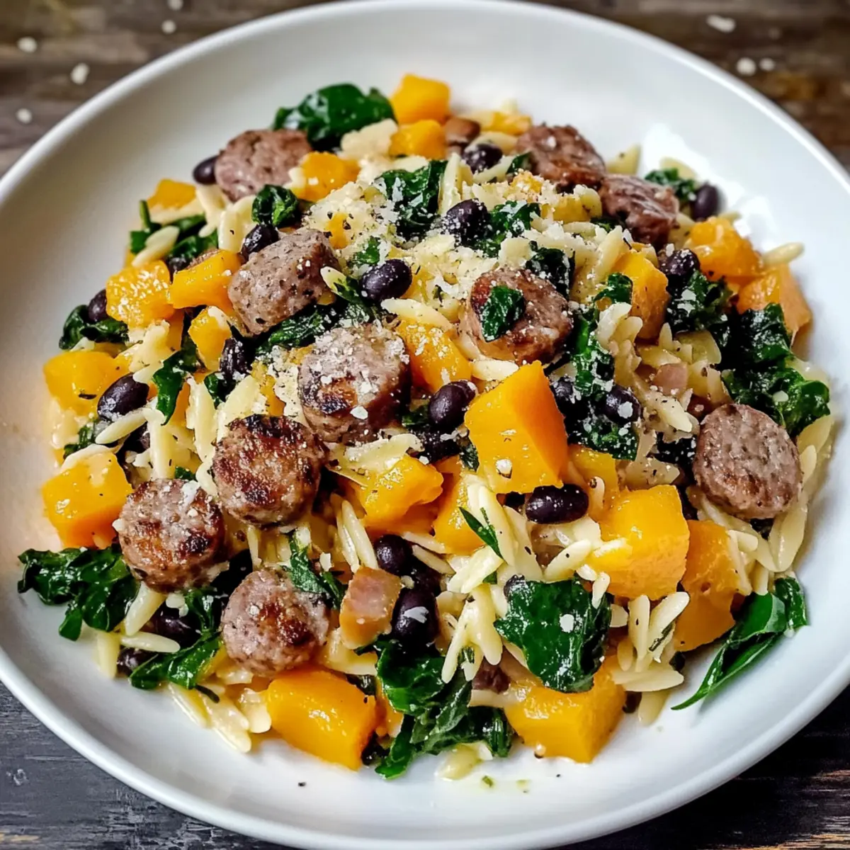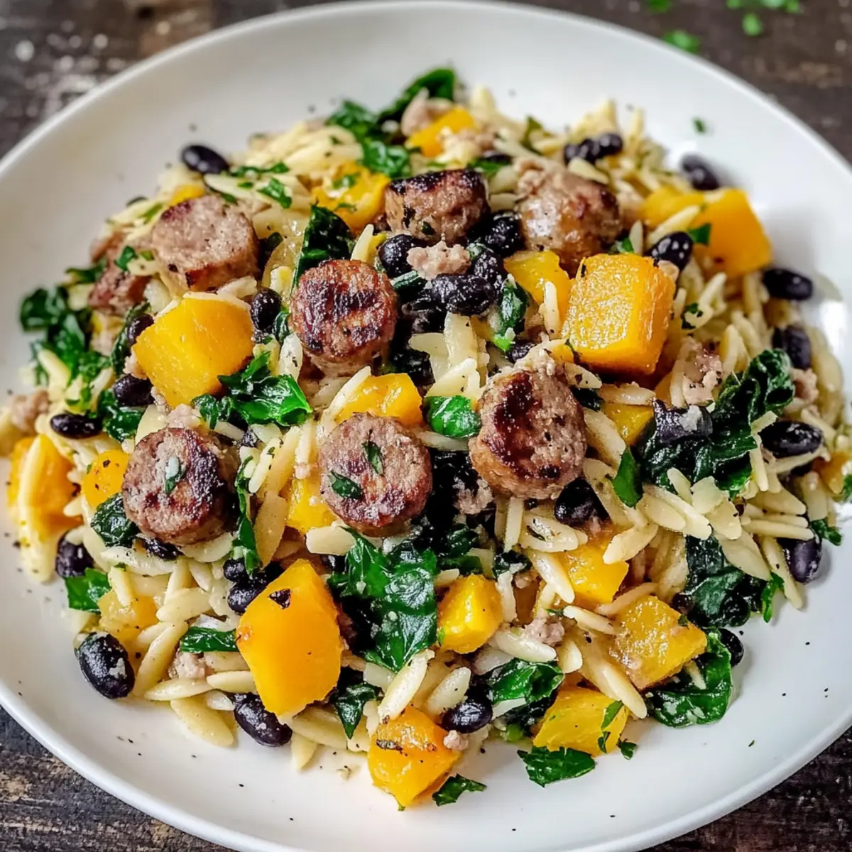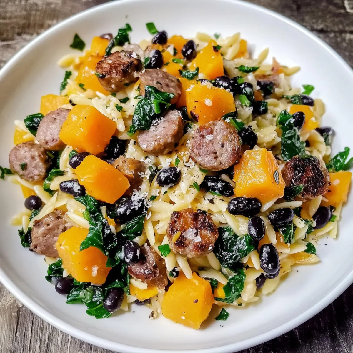Savory Butternut Squash and Black Bean Orzo with Sausage and Spinach
