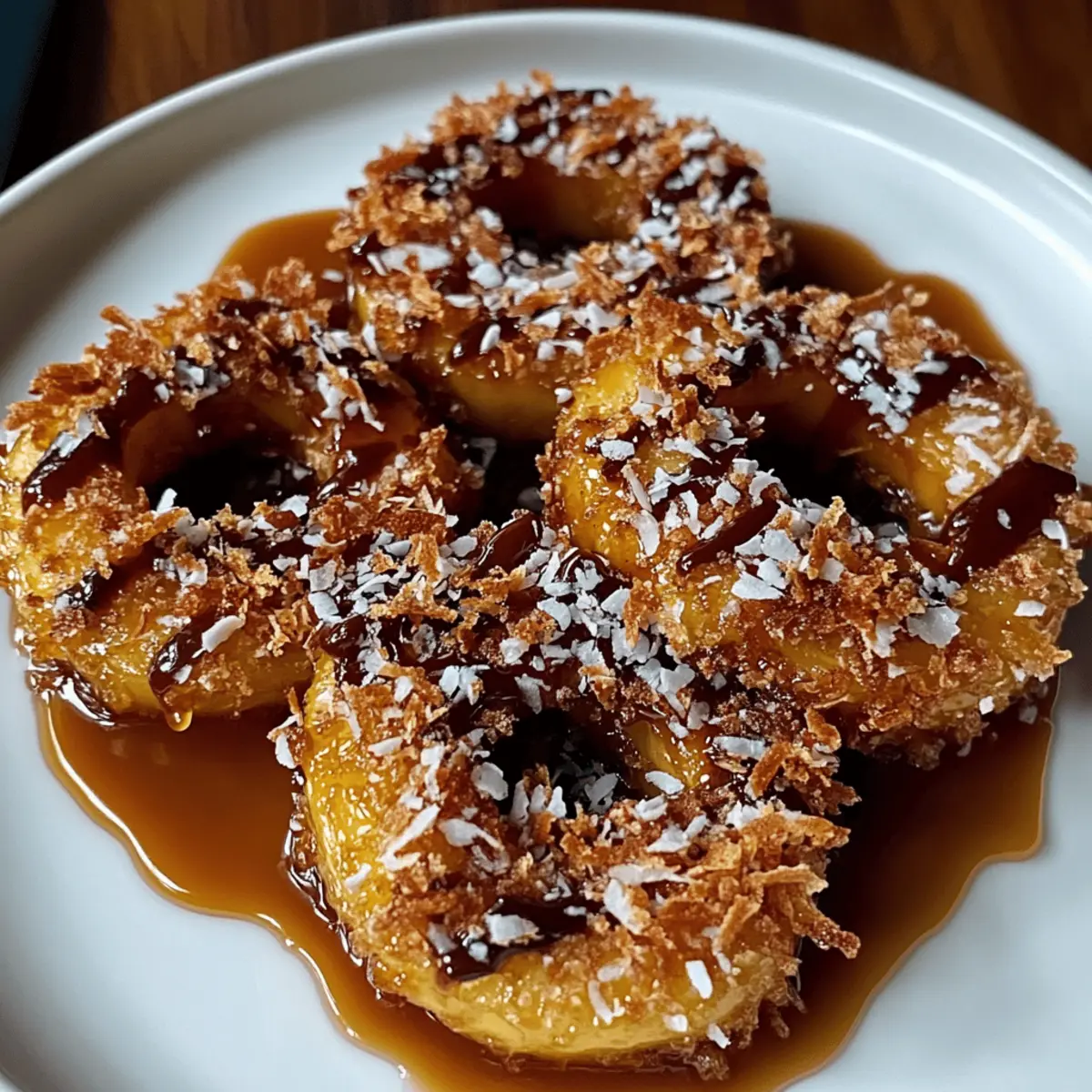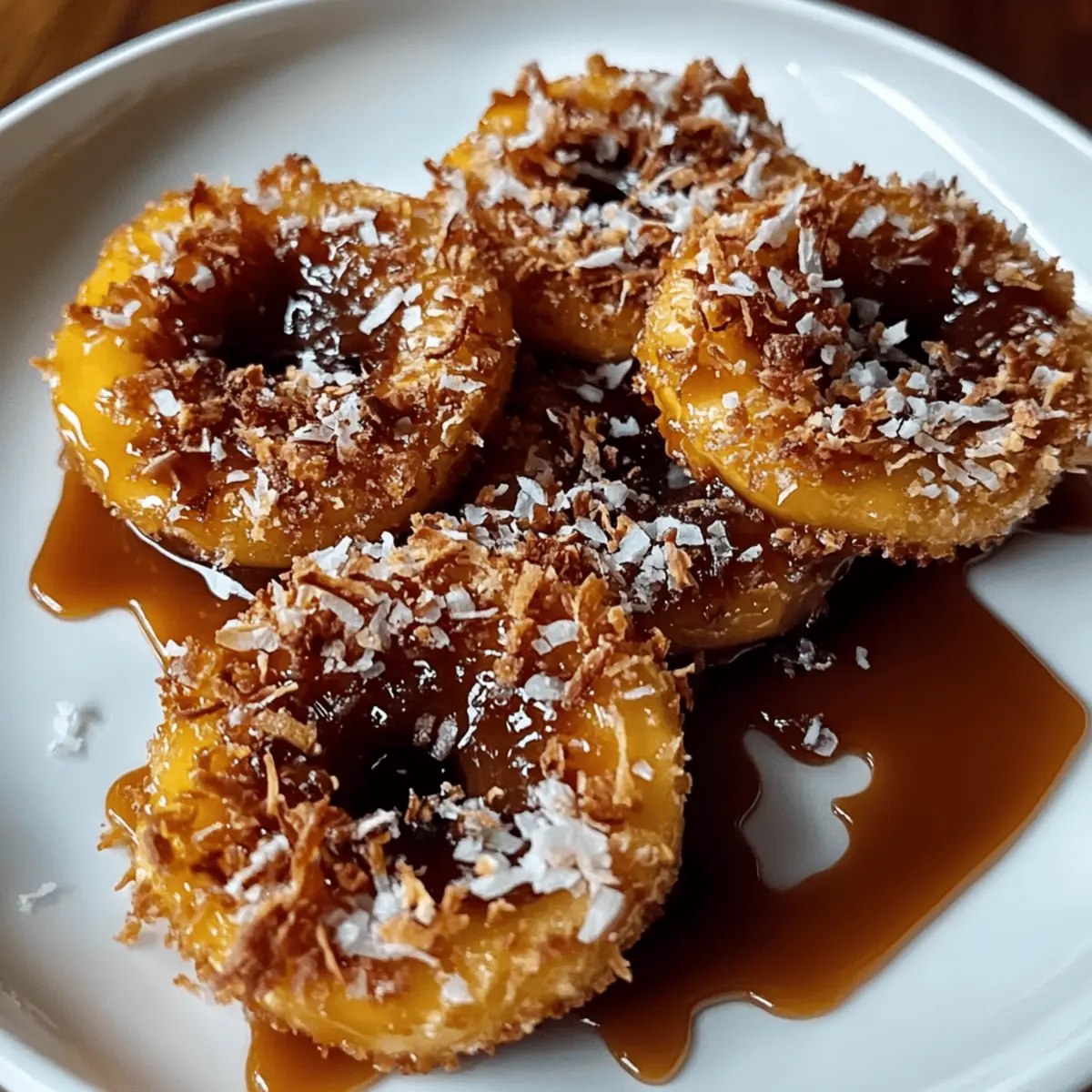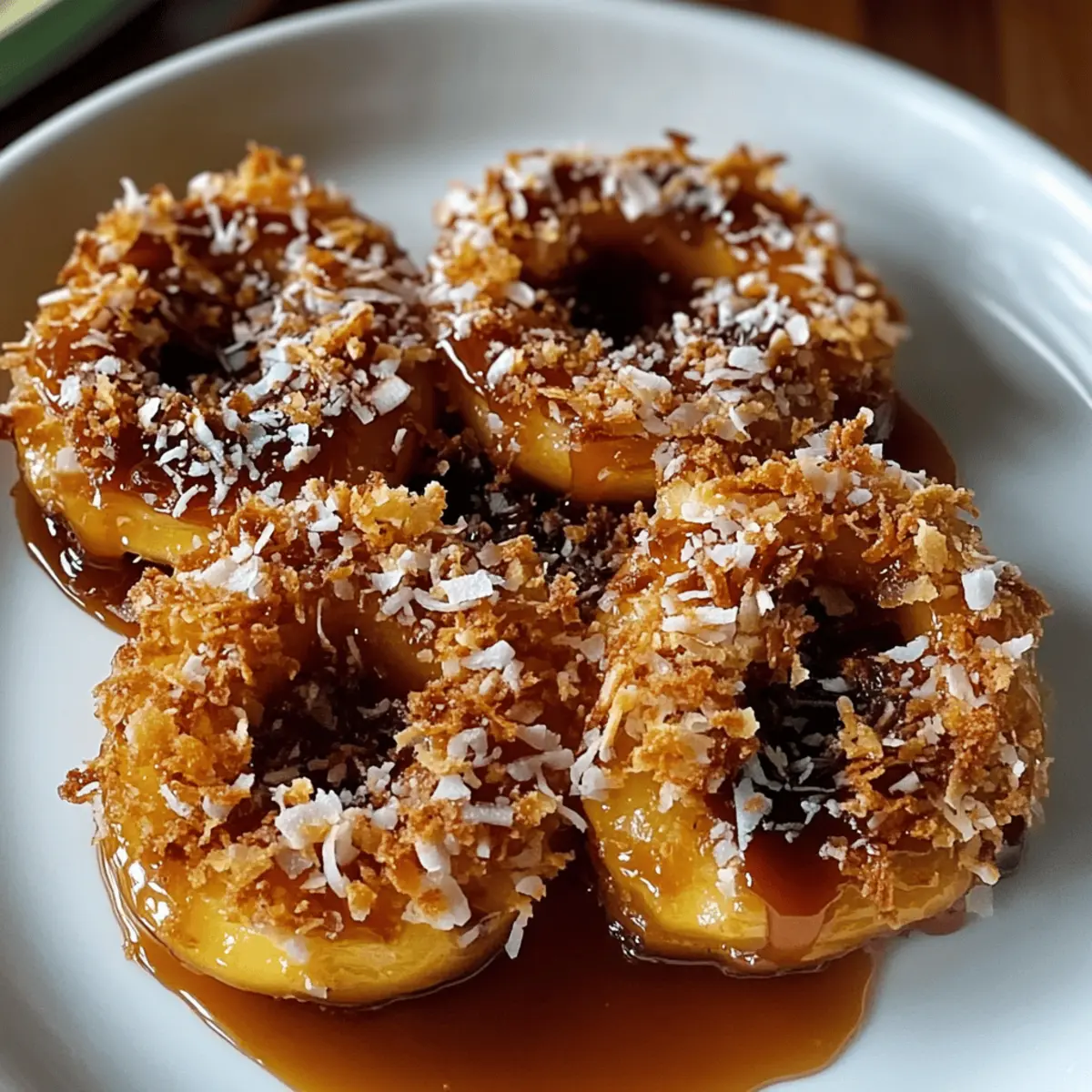 - Arrange the glazed apple rings on the prepared baking sheet and sprinkle shredded coconut on top.