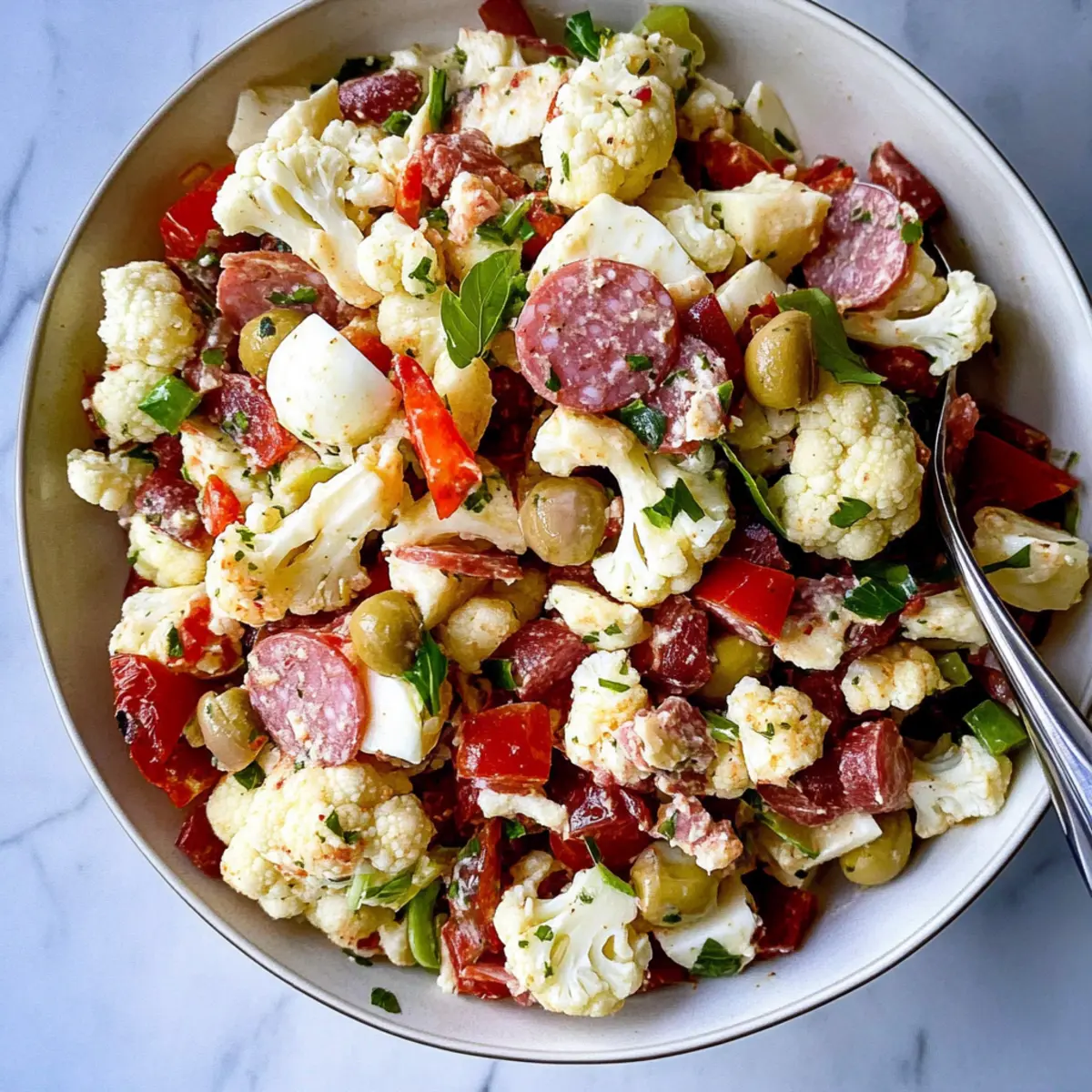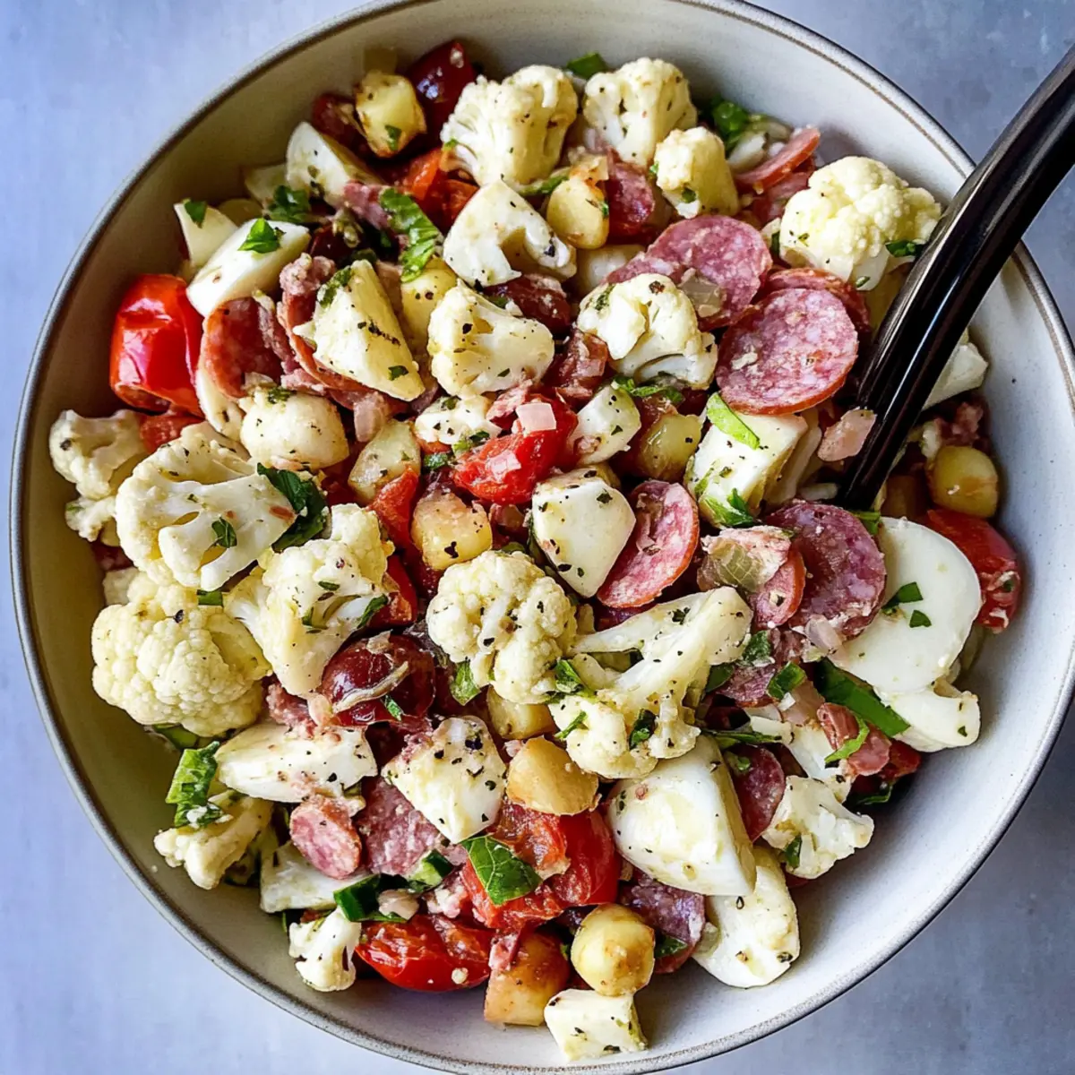 - In a large mixing bowl, combine the fresh cauliflower florets, finely chopped red onion, coarsely chopped roasted red bell peppers, drained garbanzo beans, and coarsely chopped marinated artichoke hearts. Add pitted and sliced Kalamata olives, chopped pepperoncini, and diced mozzarella or provolone cheese, stirring in the coarsely chopped Italian salami and chopped parsley until evenly distributed.