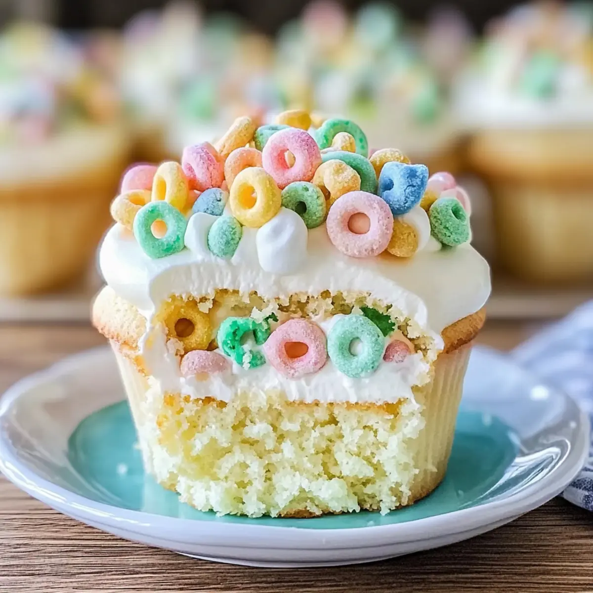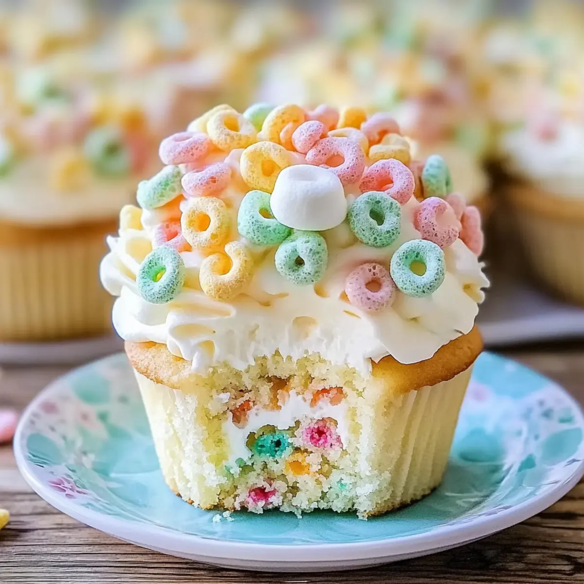 - Finish Cupcakes: Pipe frosting onto cupcakes and top with Lucky Charms marshmallows.