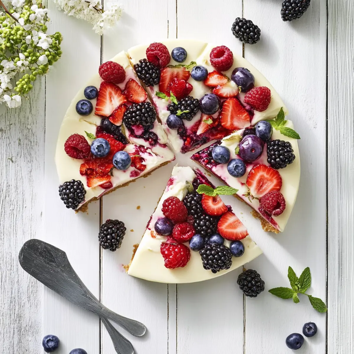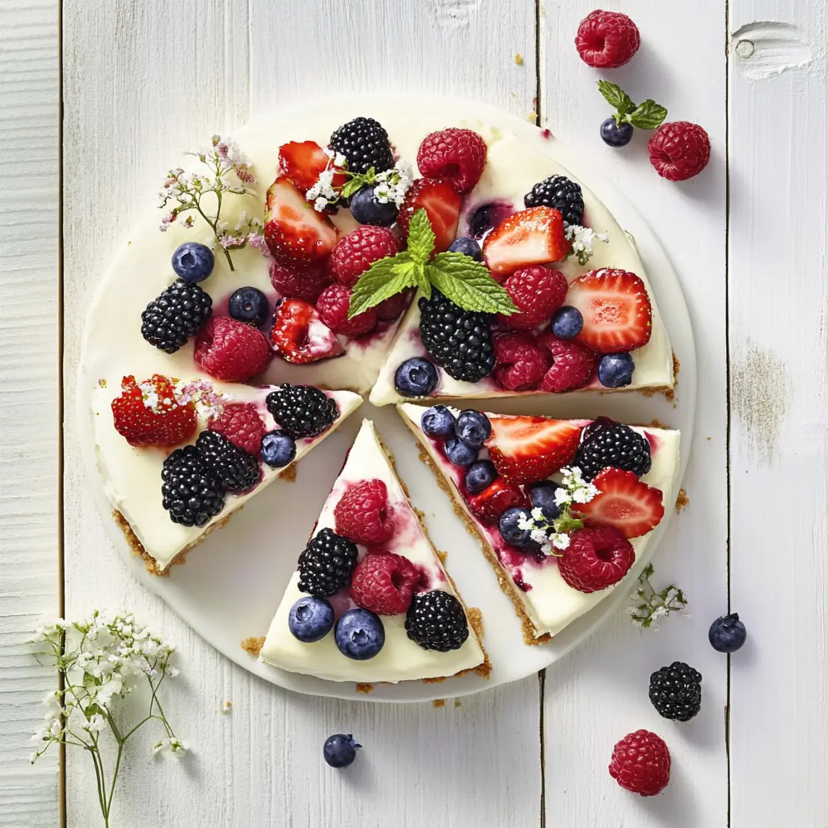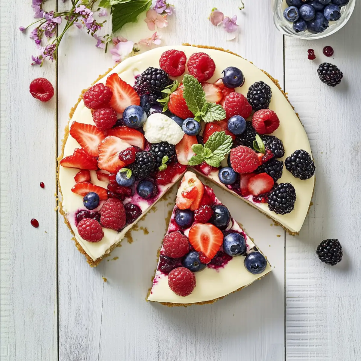 Berry Bliss: Topped with fresh berries, this cheesecake bursts with vibrant colors and flavors, inviting seasonal goodness to every slice.