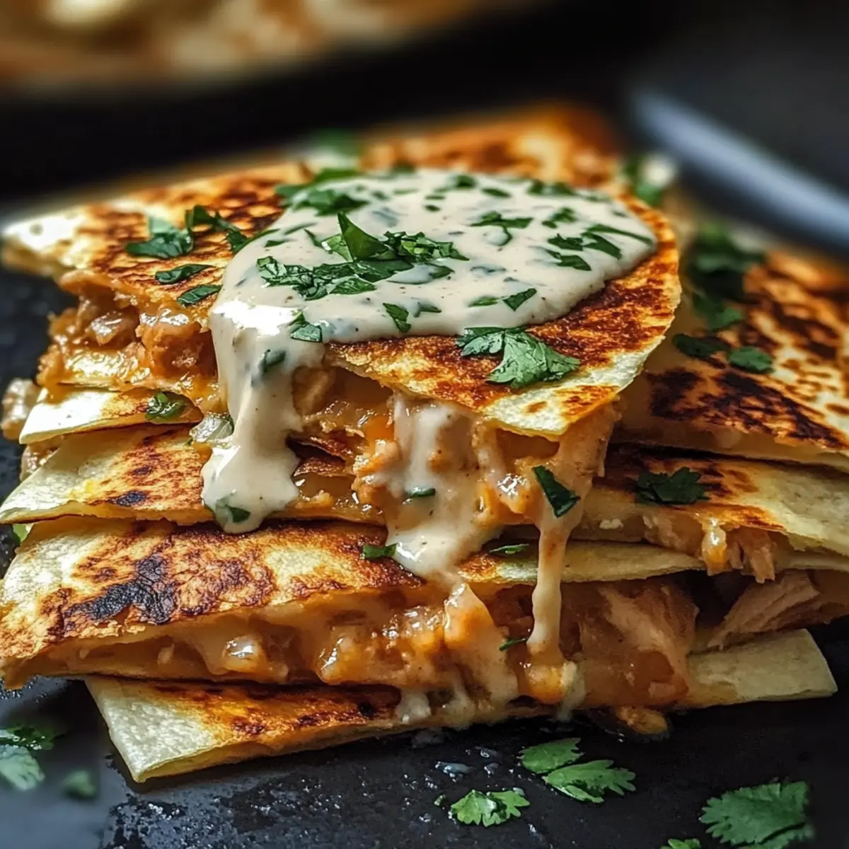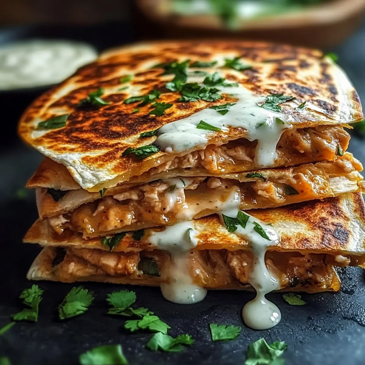 - Assemble the quesadillas by layering cheese, chicken, and more cheese between tortillas.