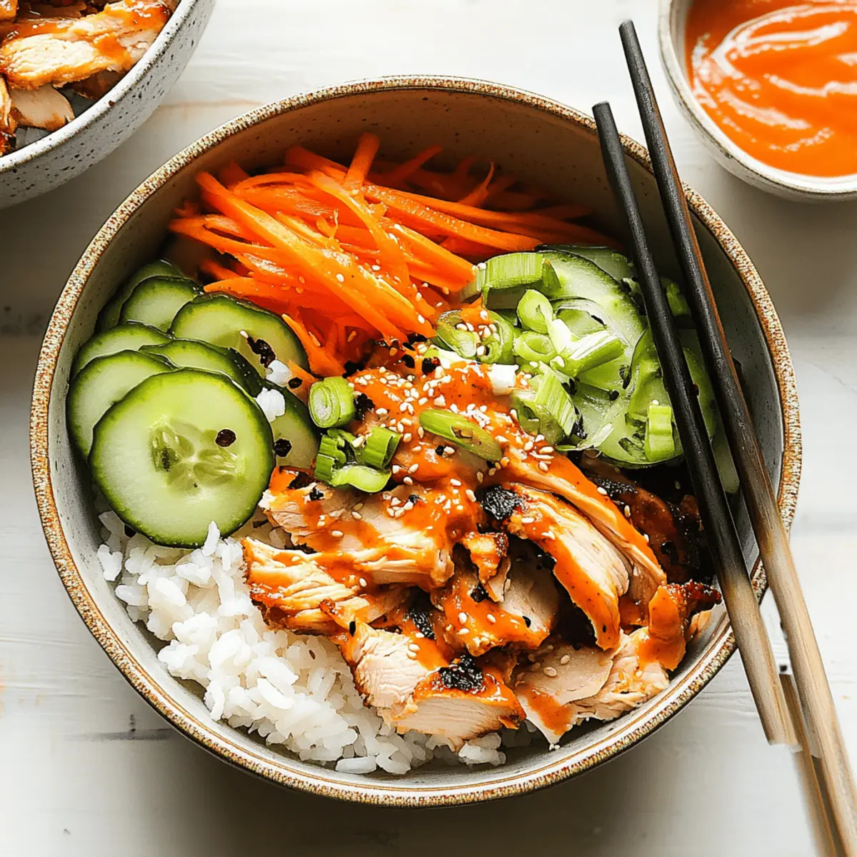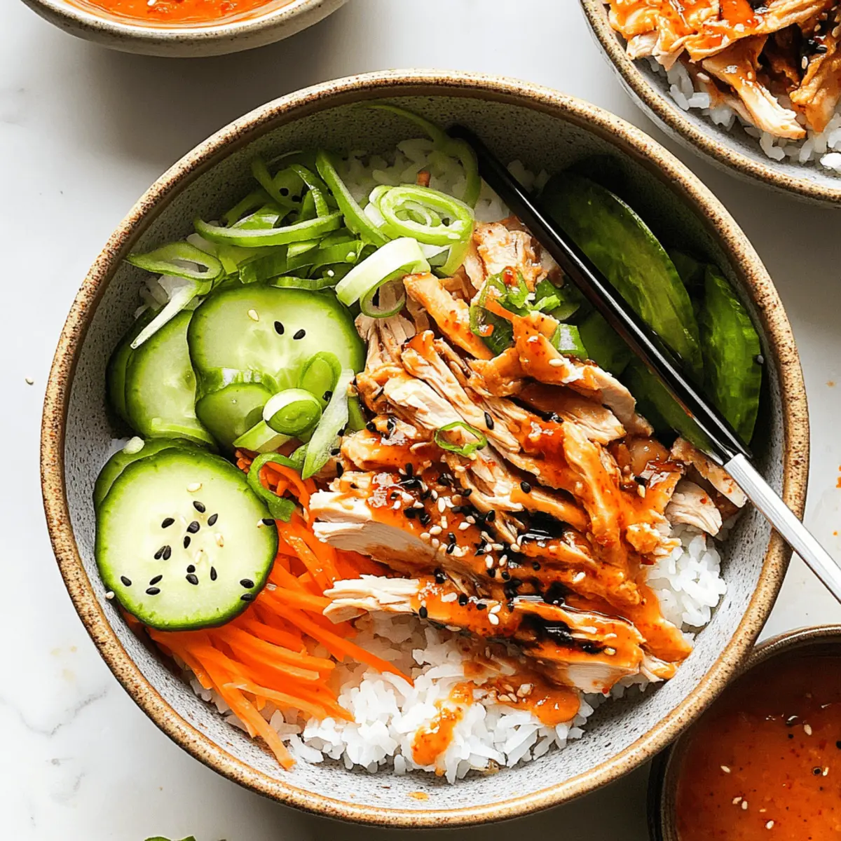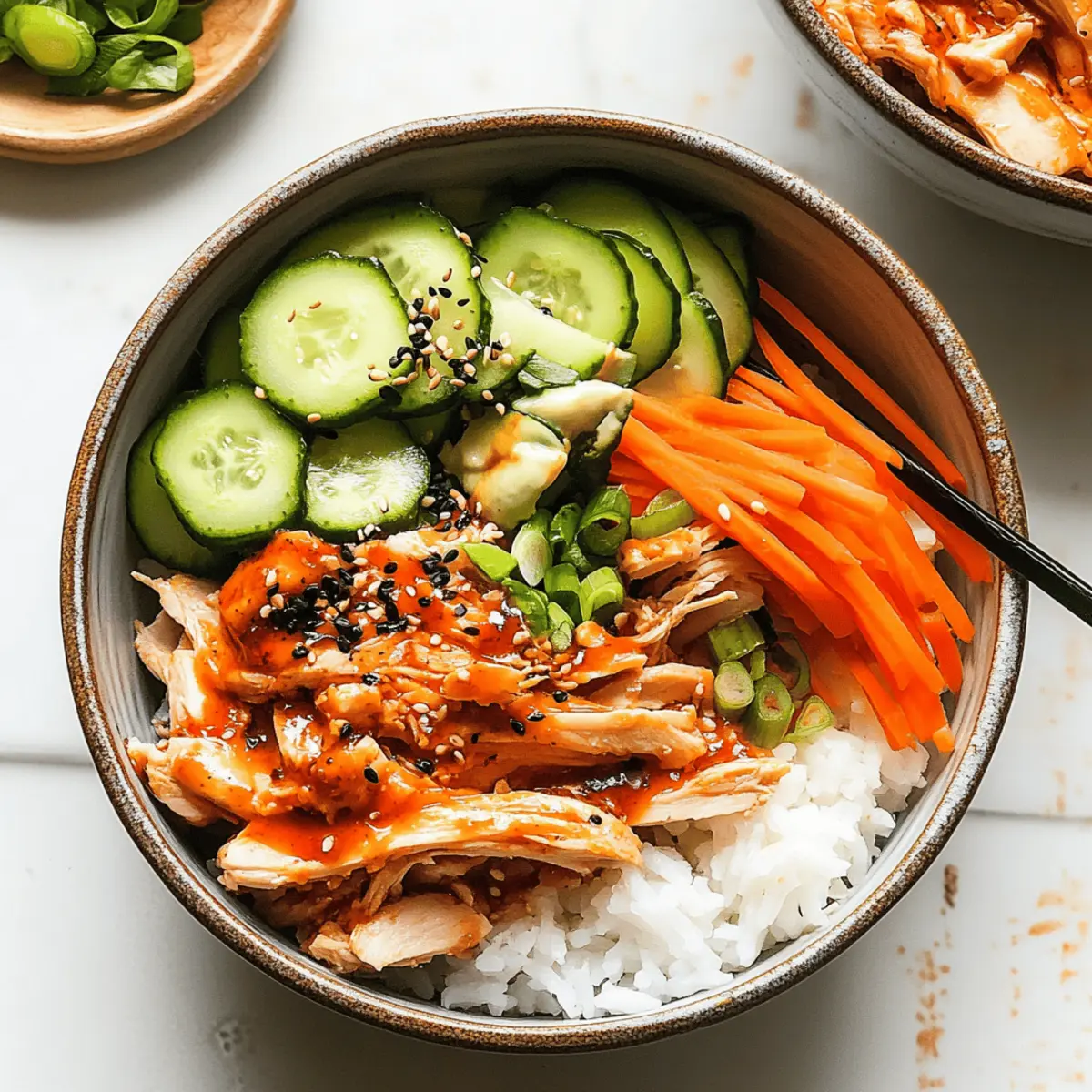 - Assemble each bowl with a base of rice, followed by shredded chicken, carrots, cucumbers, green onions, sesame seeds, and drizzle with gochujang spicy mayo.