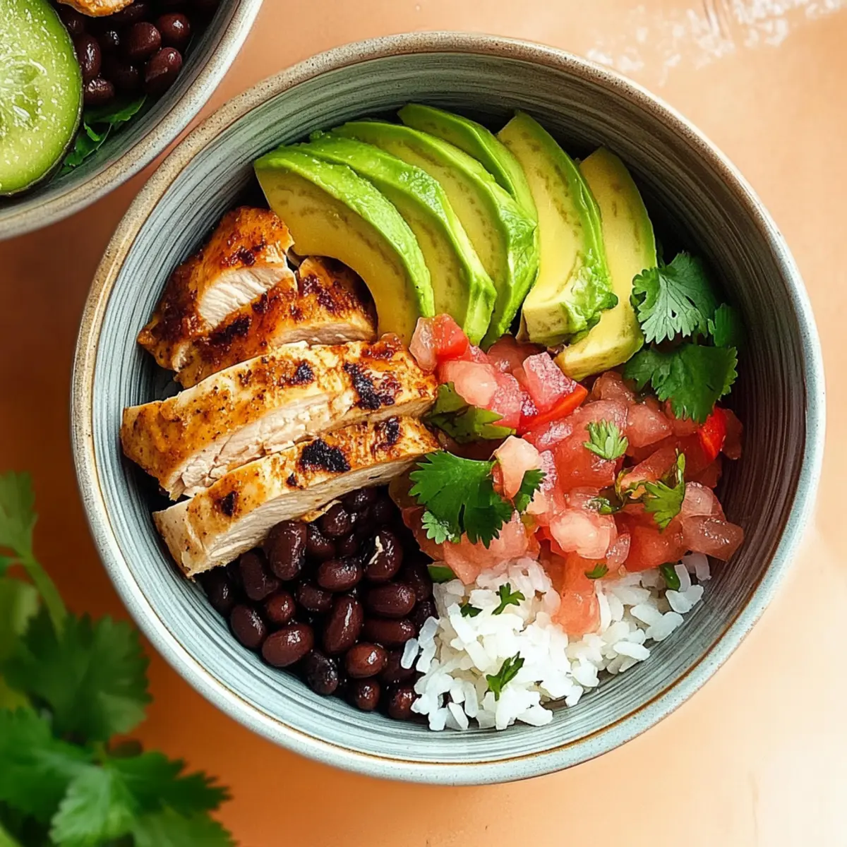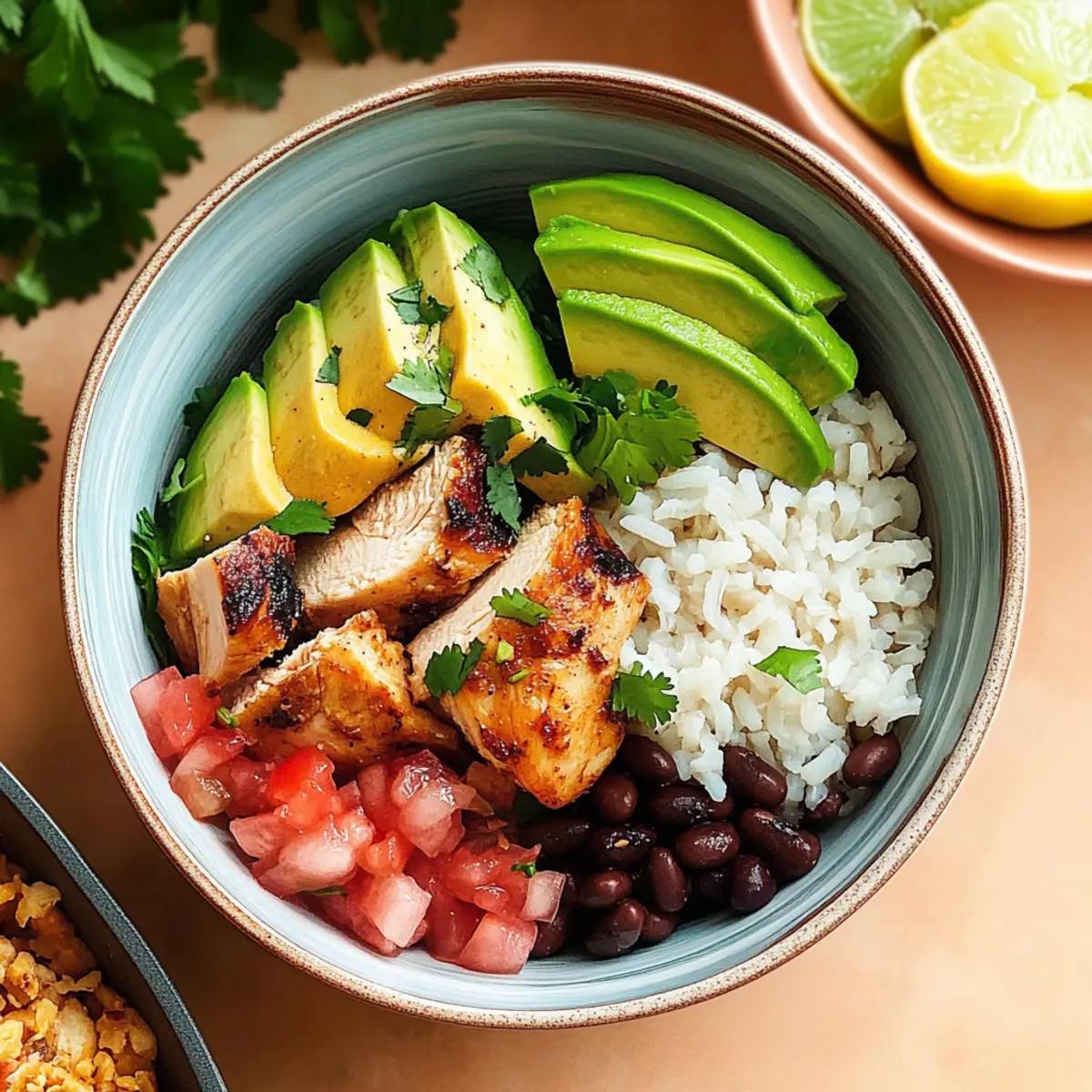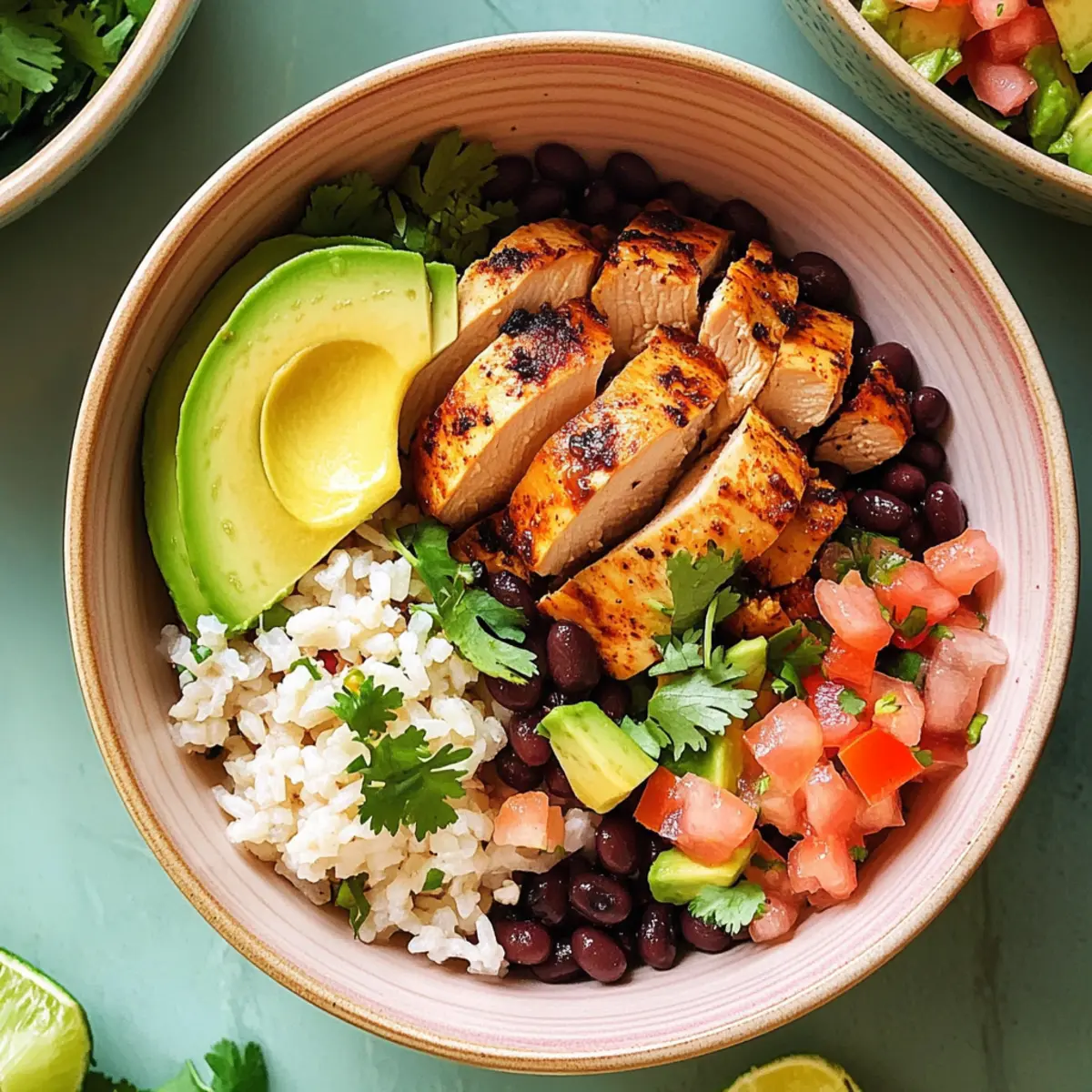 1. To create your Chicken Taco Bowls, start by dividing 3 cups of cooked white rice among four serving bowls. Spoon a generous helping of the seasoned black beans over the rice. Next, layer the sliced chicken on top, followed by ½ cup of pico de gallo, sliced avocado, and fresh chopped cilantro for garnish. Offer lime wedges to squeeze over the bowls for that zesty finish.