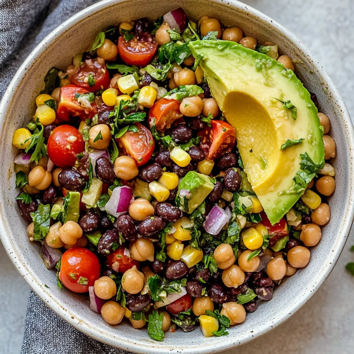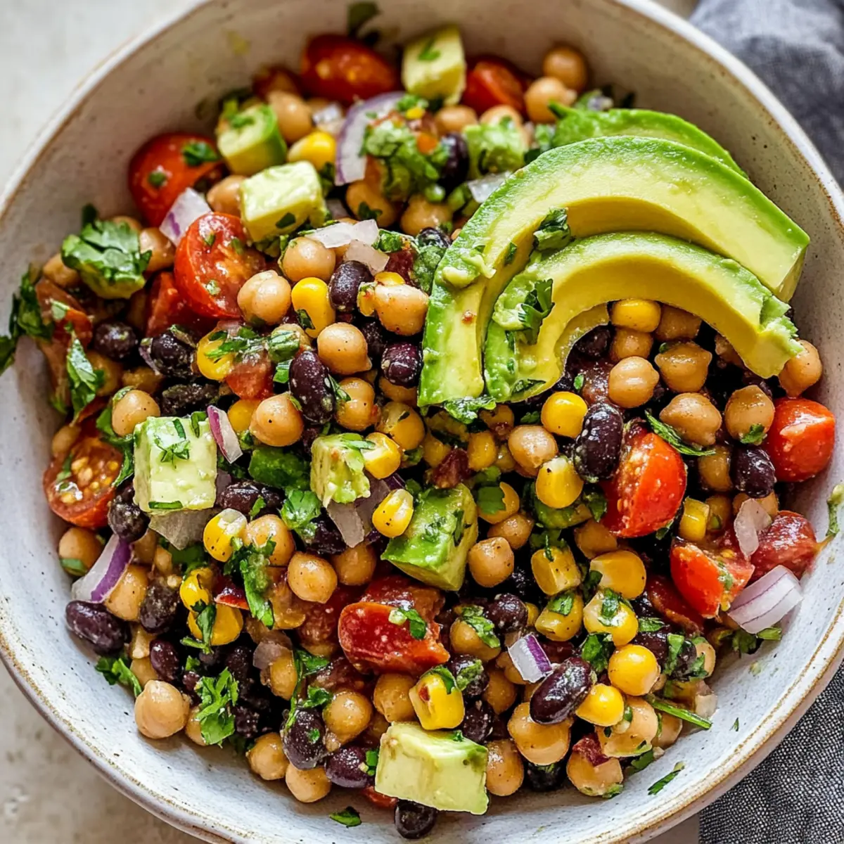 Vibrant Colors: Featuring a stunning mix of chickpeas, black beans, and fresh veggies, this salad is a feast for the eyes.