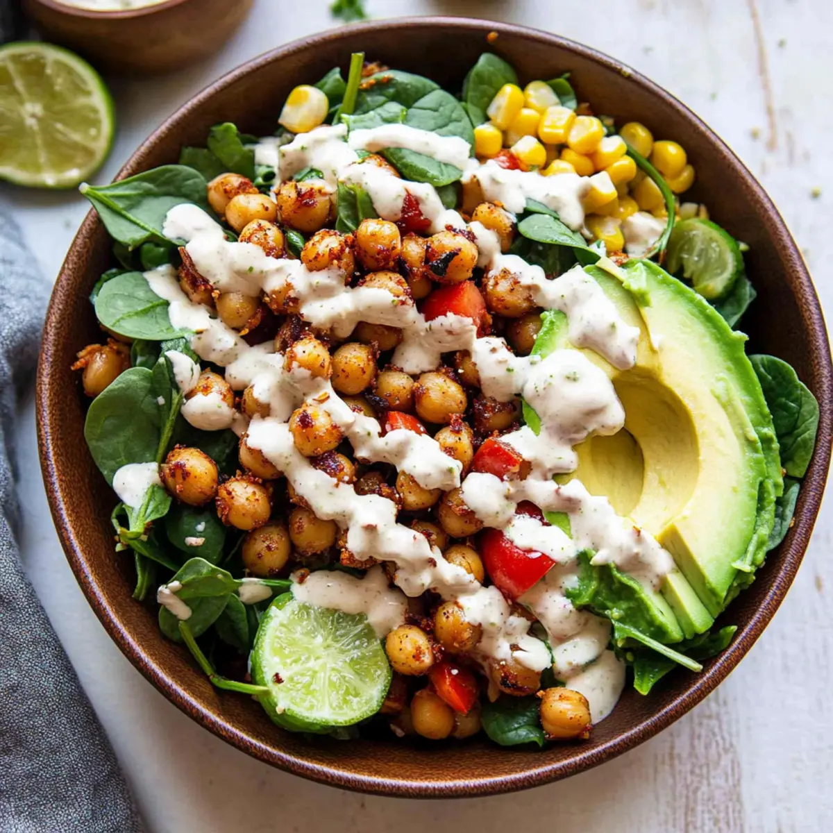 In a small mixing bowl, whisk together tahini, fresh lime juice, honey, and a pinch of salt until smooth and creamy. If the dressing is too thick, feel free to add a splash of water to reach your desired consistency. This dressing will bring the flavors of your Crispy Chili Lime Chickpea Salad together beautifully.