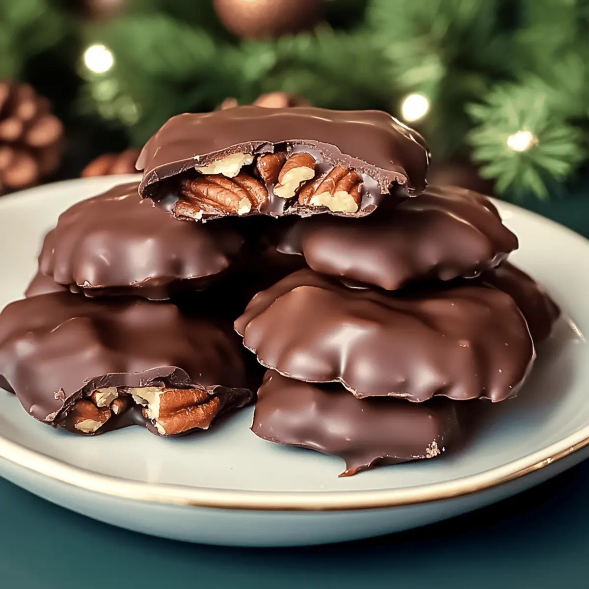 - Scoop out portions of the pecan mixture, form them into patties, and dip each one into the melted chocolate.