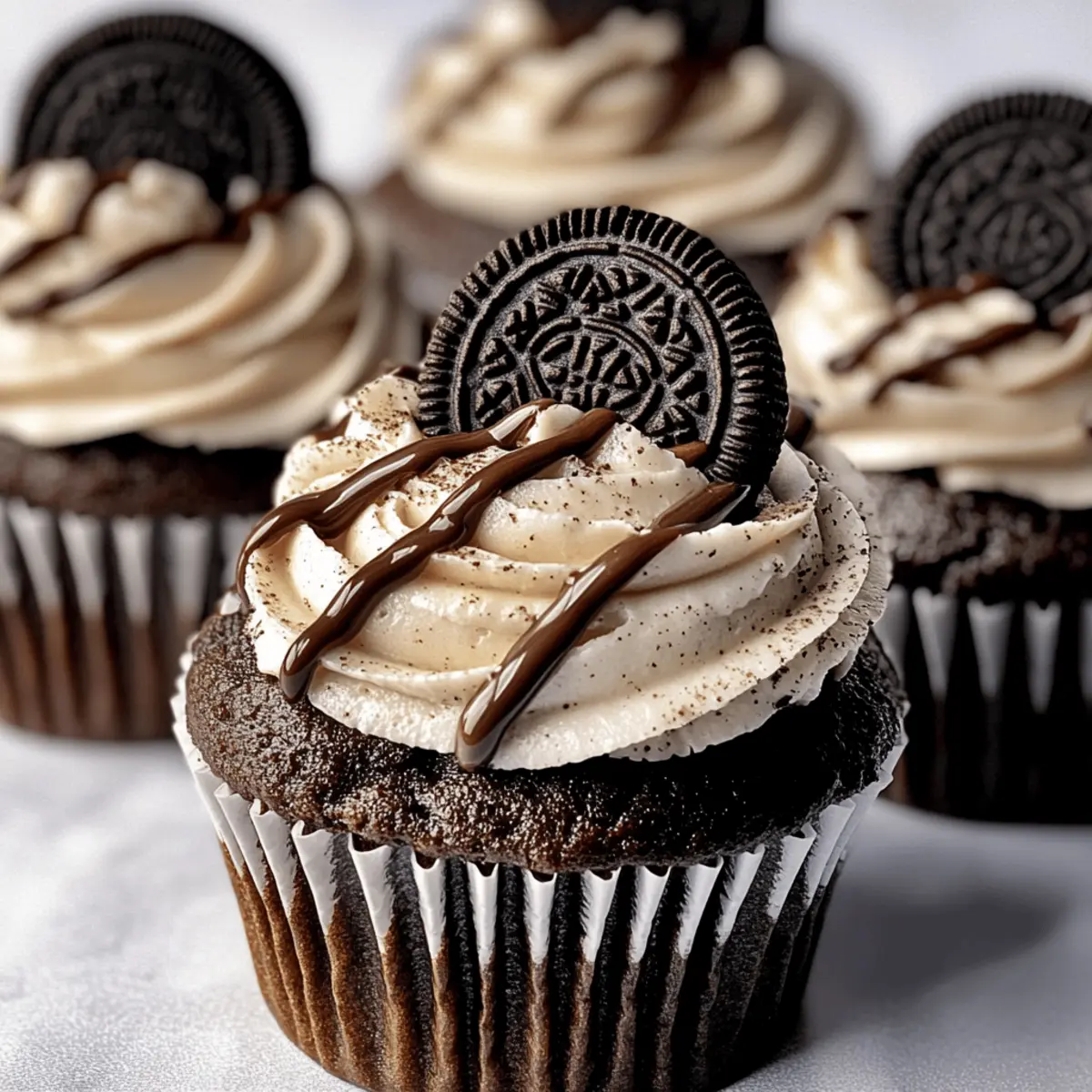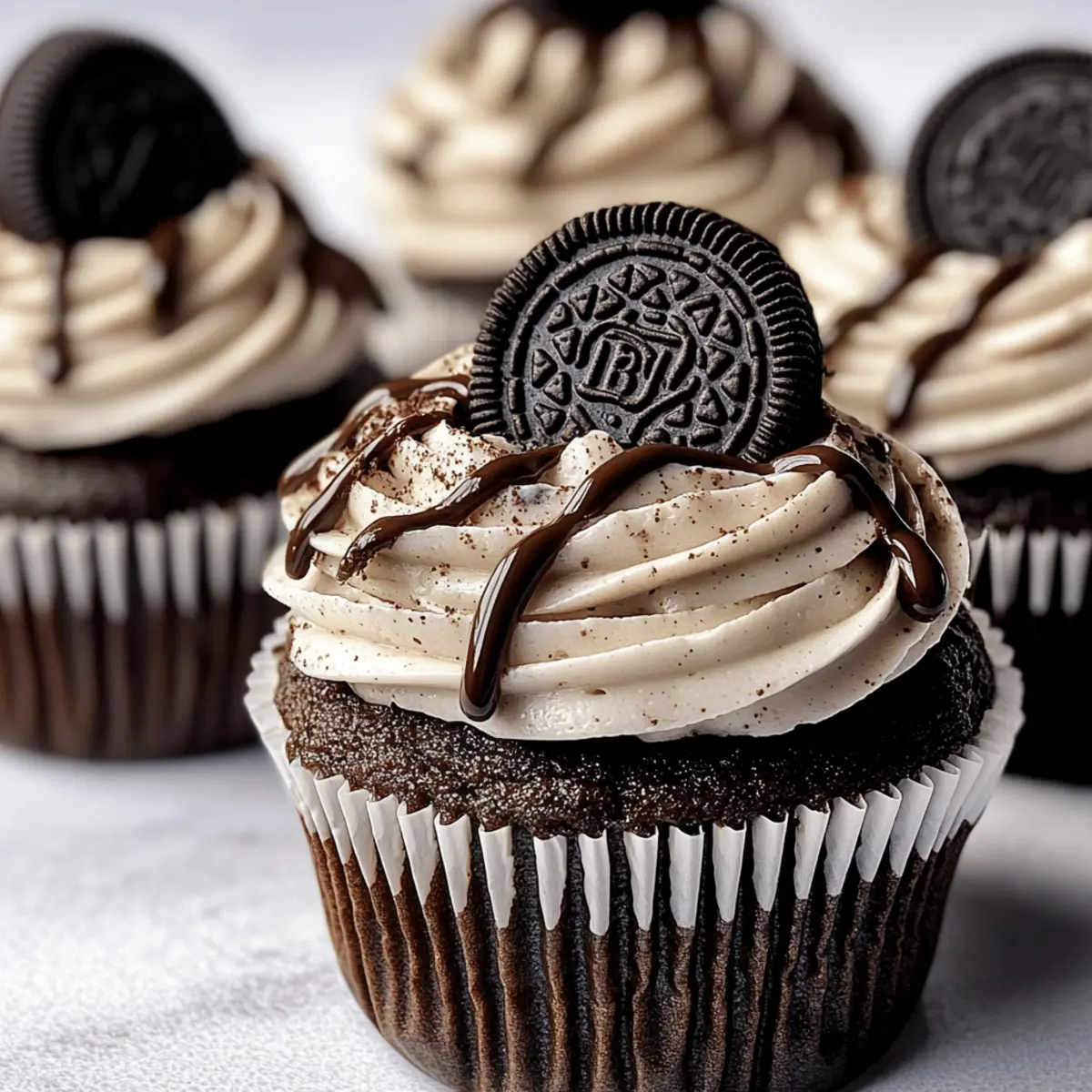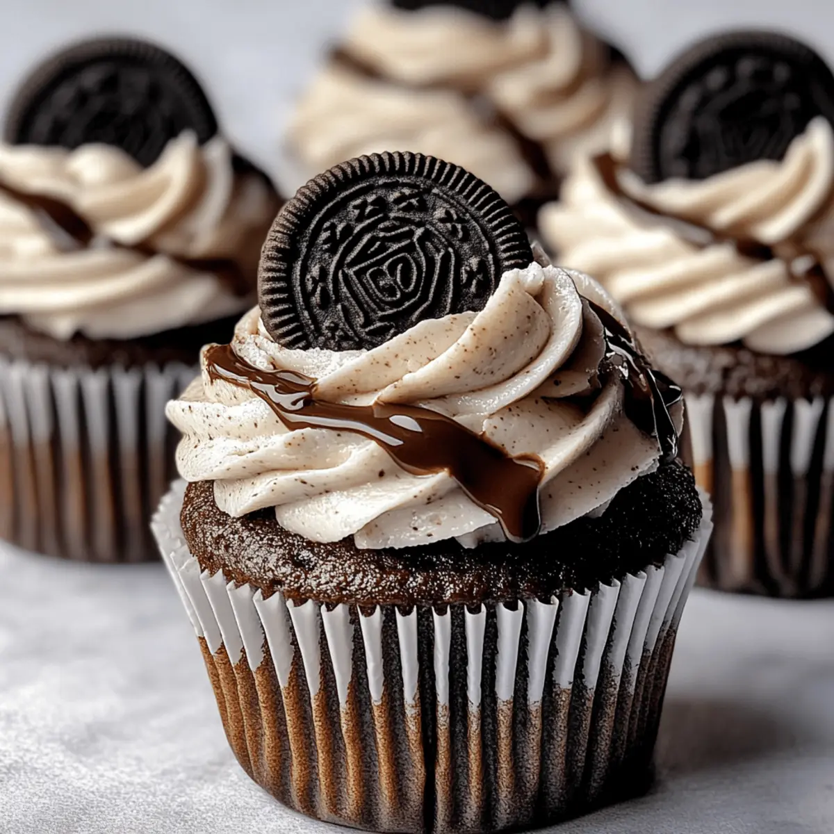 - Frost cupcakes with cookies and cream buttercream, drizzle with ganache, and top with halved Oreo cookies.