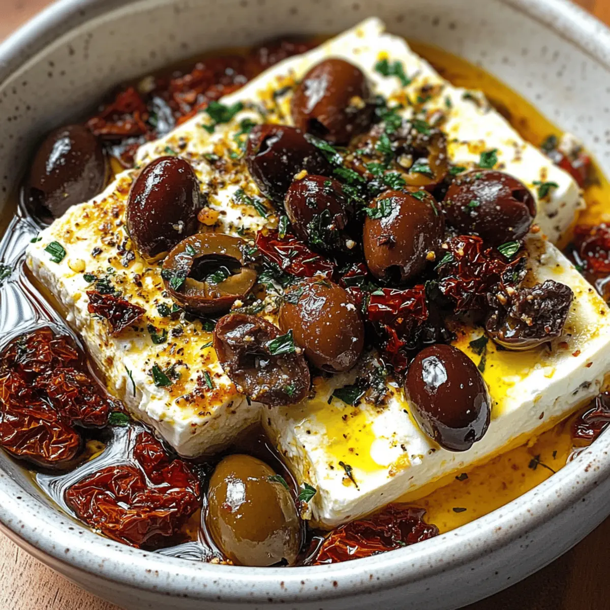 - In a baking dish, layer the crumbled Greek feta as the base. Add olives, sun-dried tomatoes, and minced garlic evenly.