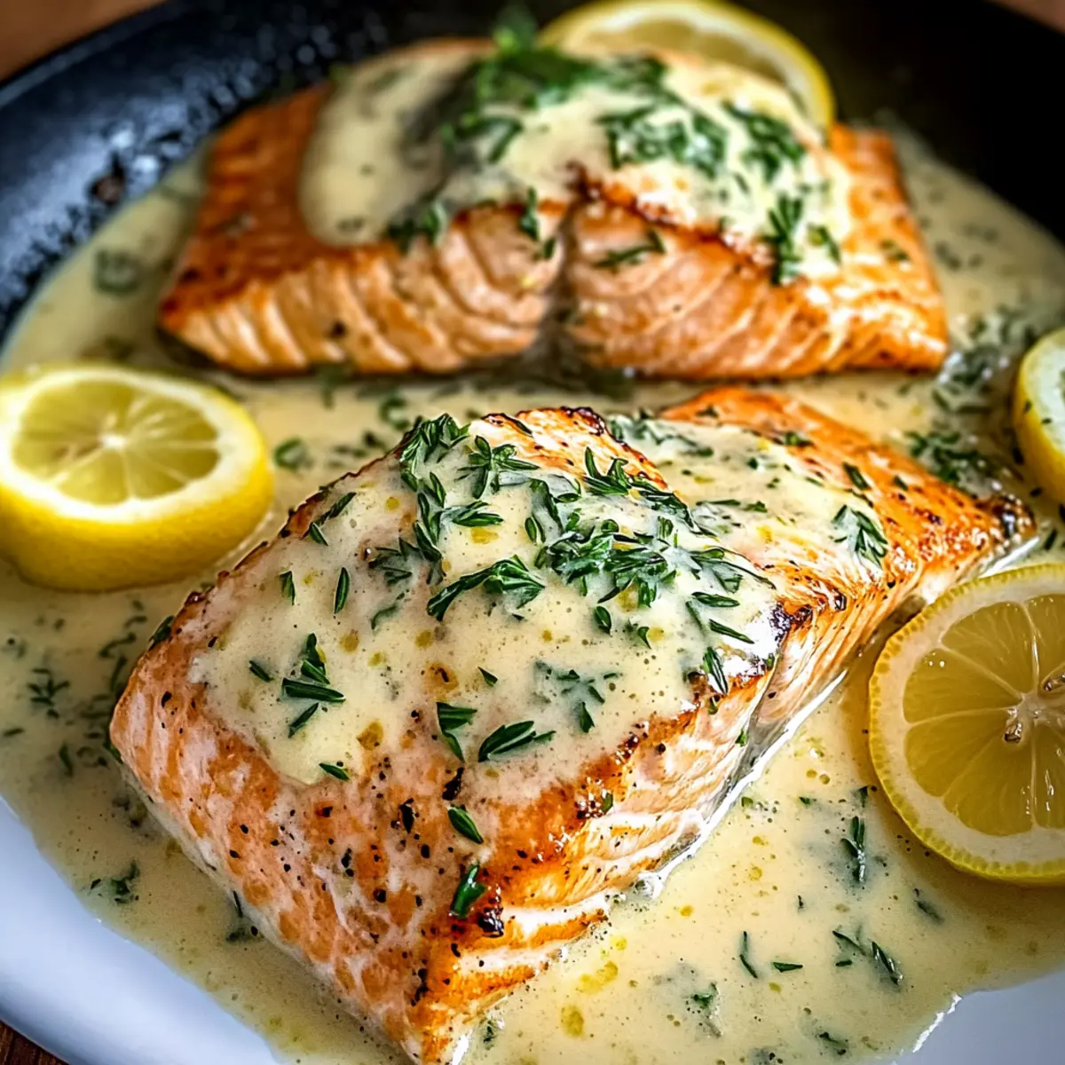 Carefully return the seared salmon fillets back into the skillet, spooning the creamy sauce generously over each piece. Let them warm through for about 1-2 minutes, ensuring the salmon absorbs the delightful flavors while maintaining its flaky texture. Just before serving, stir in finely chopped parsley for a fresh finish that brightens the dish.