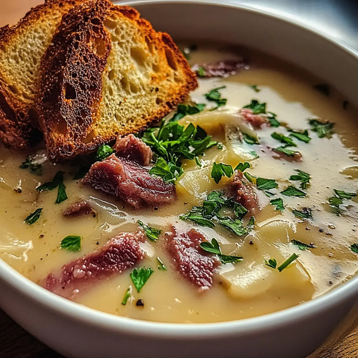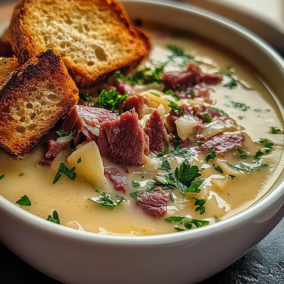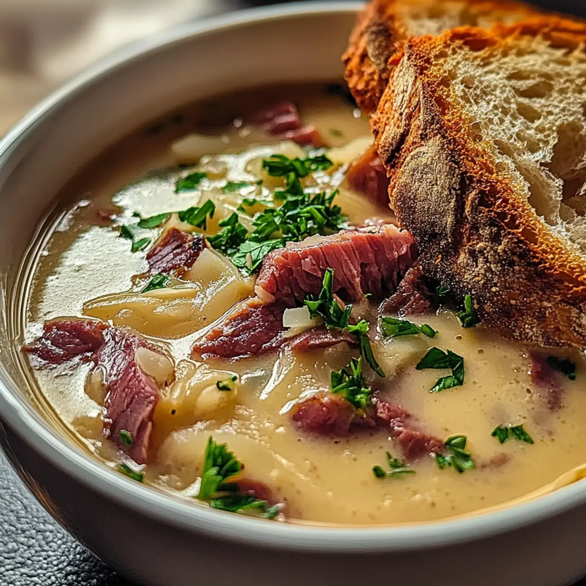8. Ladle the piping hot Creamy Reuben Soup into serving bowls, garnishing with crispy rye bread croutons and a sprinkle of chopped parsley.