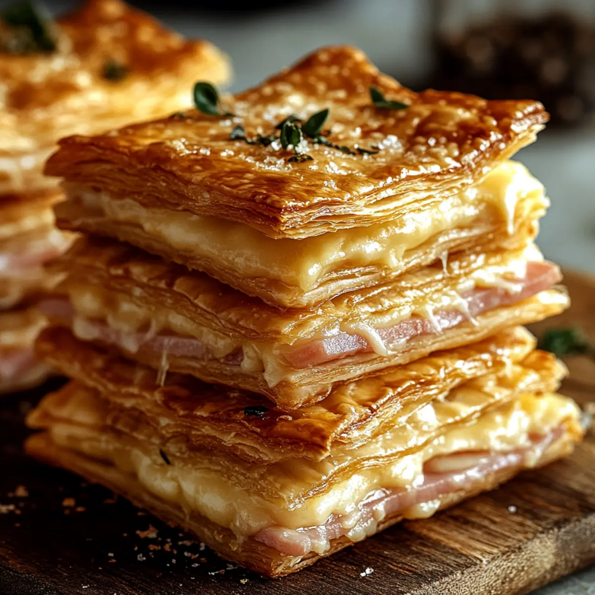 Once out of the oven, let your Crispy Ham & Cheese Puff Pastry Stacks cool for a few moments on a wire rack. For an extra flavor boost, sprinkle with fresh herbs before serving. This final touch elevates the taste and presentation, making them even more irresistible!