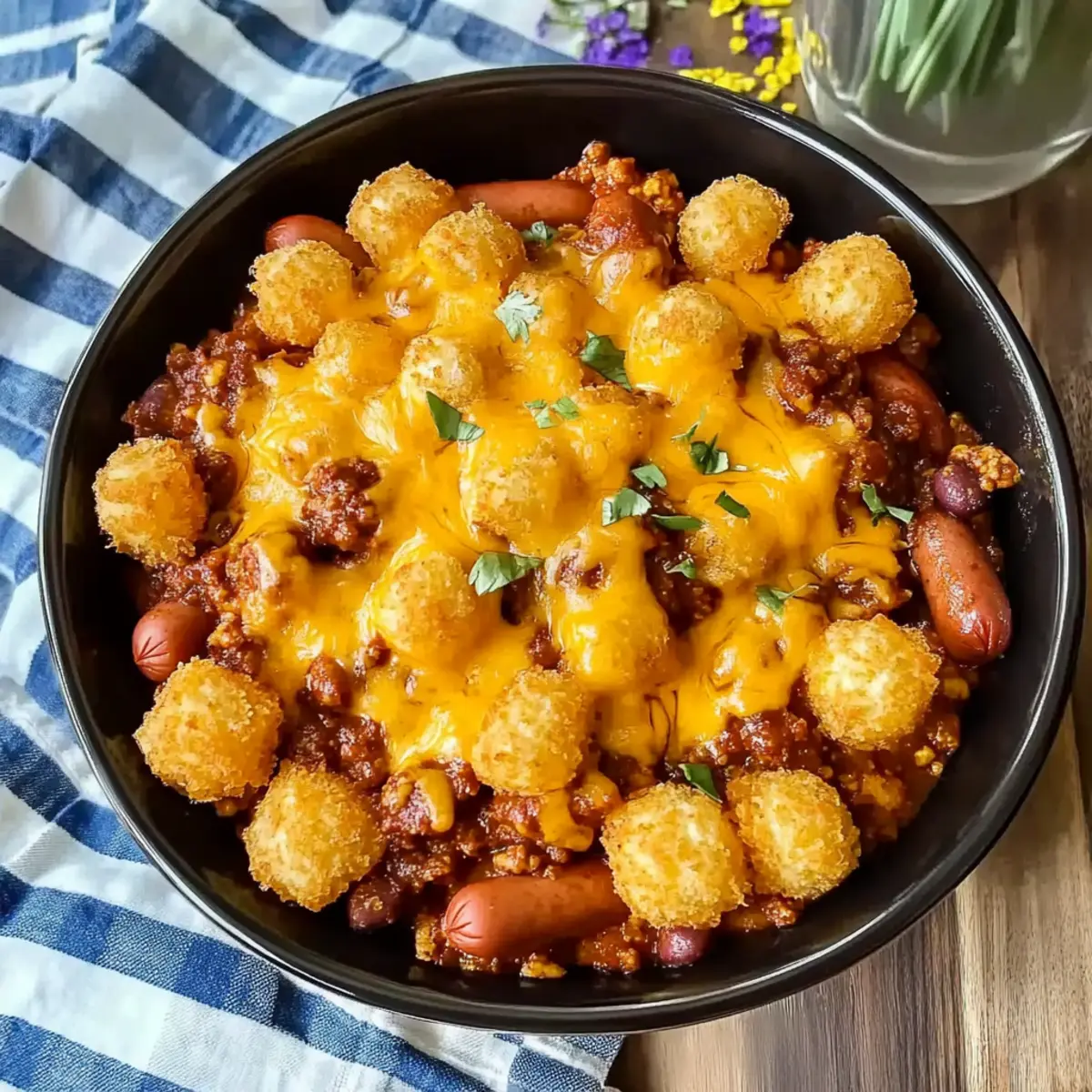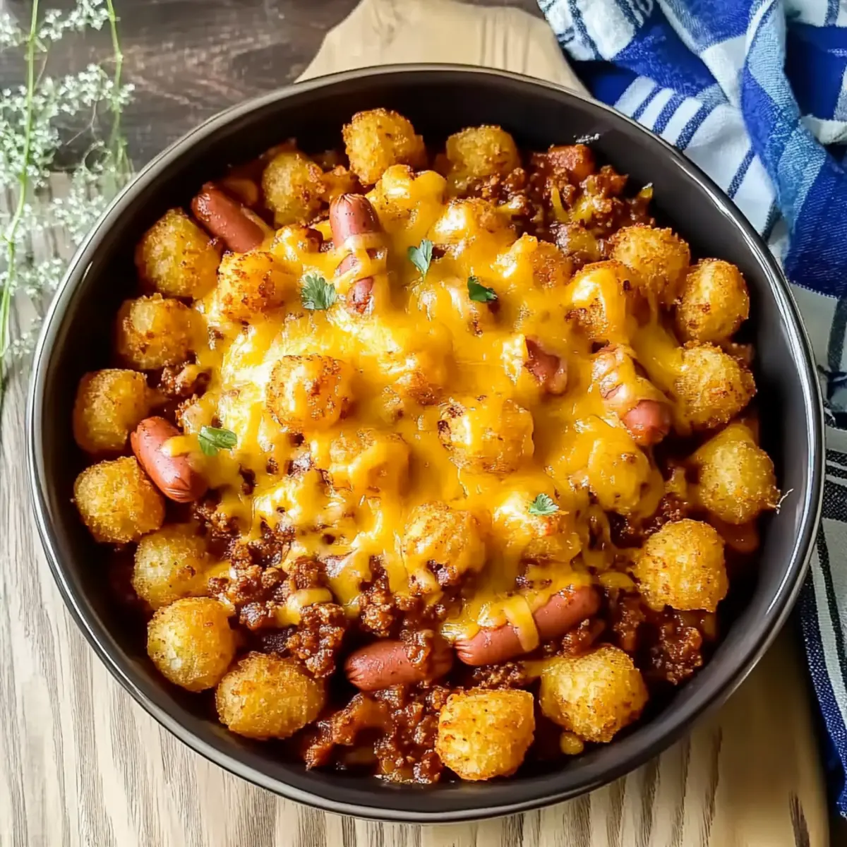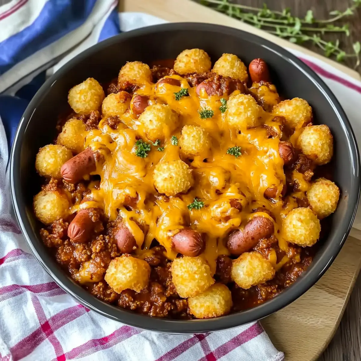 Comforting flavors combine hot dogs, cheesy goodness, and crispy tater tots—what’s not to love?