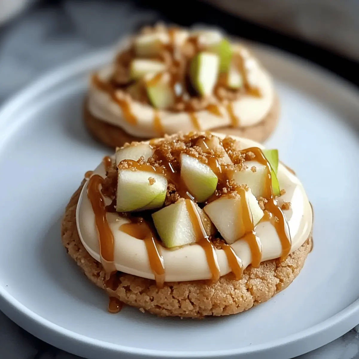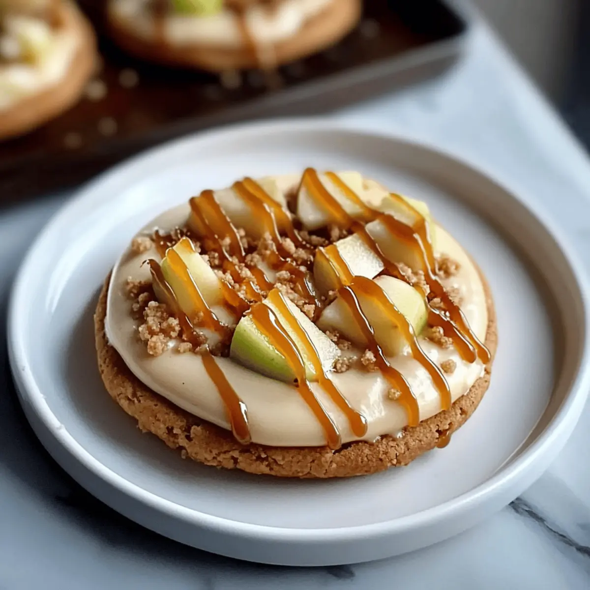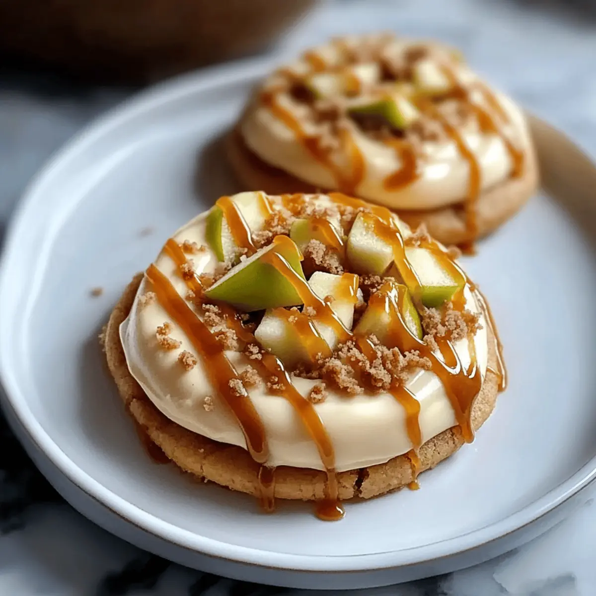 - Once cookies are cooled, generously frost each one with the creamy caramel frosting. Top with diced apples, a sprinkle of streusel, and a drizzle of caramel sauce.