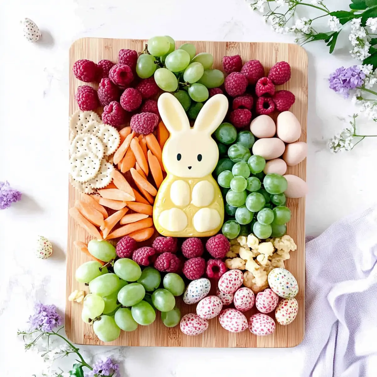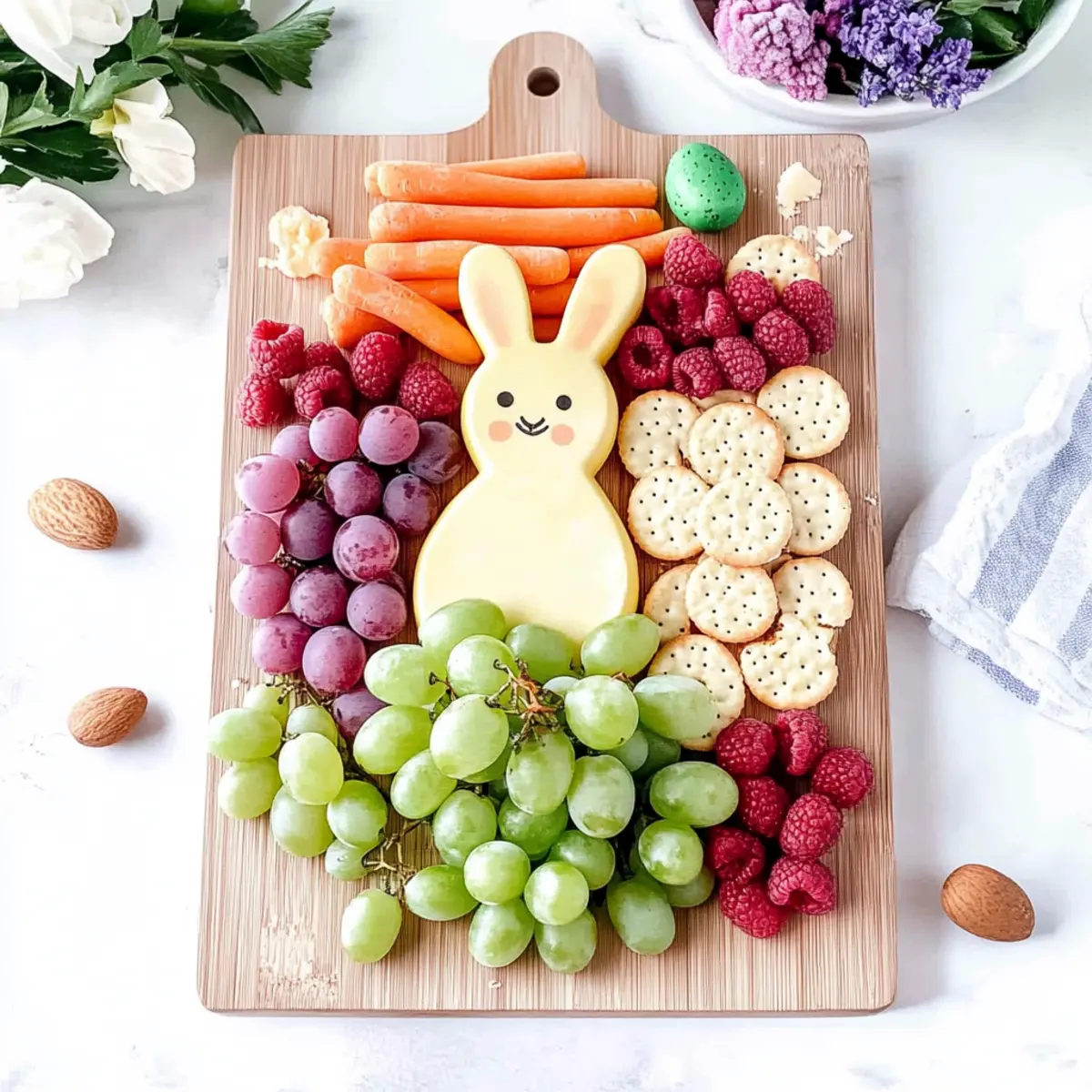 Spread a thin layer of peanut butter on large circular crackers to create a flower base. Arrange halved green grapes around the edges for petals, and place a raspberry in the center as the flower’s eye-catching core. These delightful flowers can be positioned on the board around your cheese bunny, adding both color and a playful touch to your Easter Bunny Snack Board.