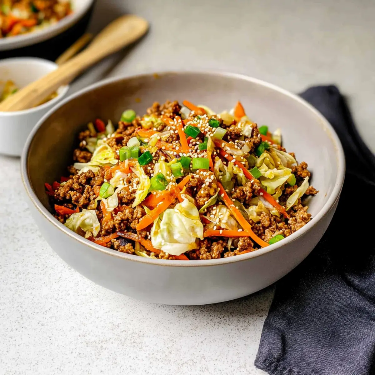 These Egg Roll in a Bowl are perfect for meal prep enthusiasts! You can brown the ground beef and prepare all your vegetables up to 24 hours in advance, then store them in airtight containers in the refrigerator. When you’re ready to enjoy this quick dinner, simply sauté the prepped ingredients with minced garlic, ginger, soy sauce, and sesame oil just before serving. To maintain quality, keep the cooked beef and veggies separate from the sauce until you’re ready to heat them. This way, you’ll have a satisfying, low-carb meal on the table with minimal effort during your busy week!