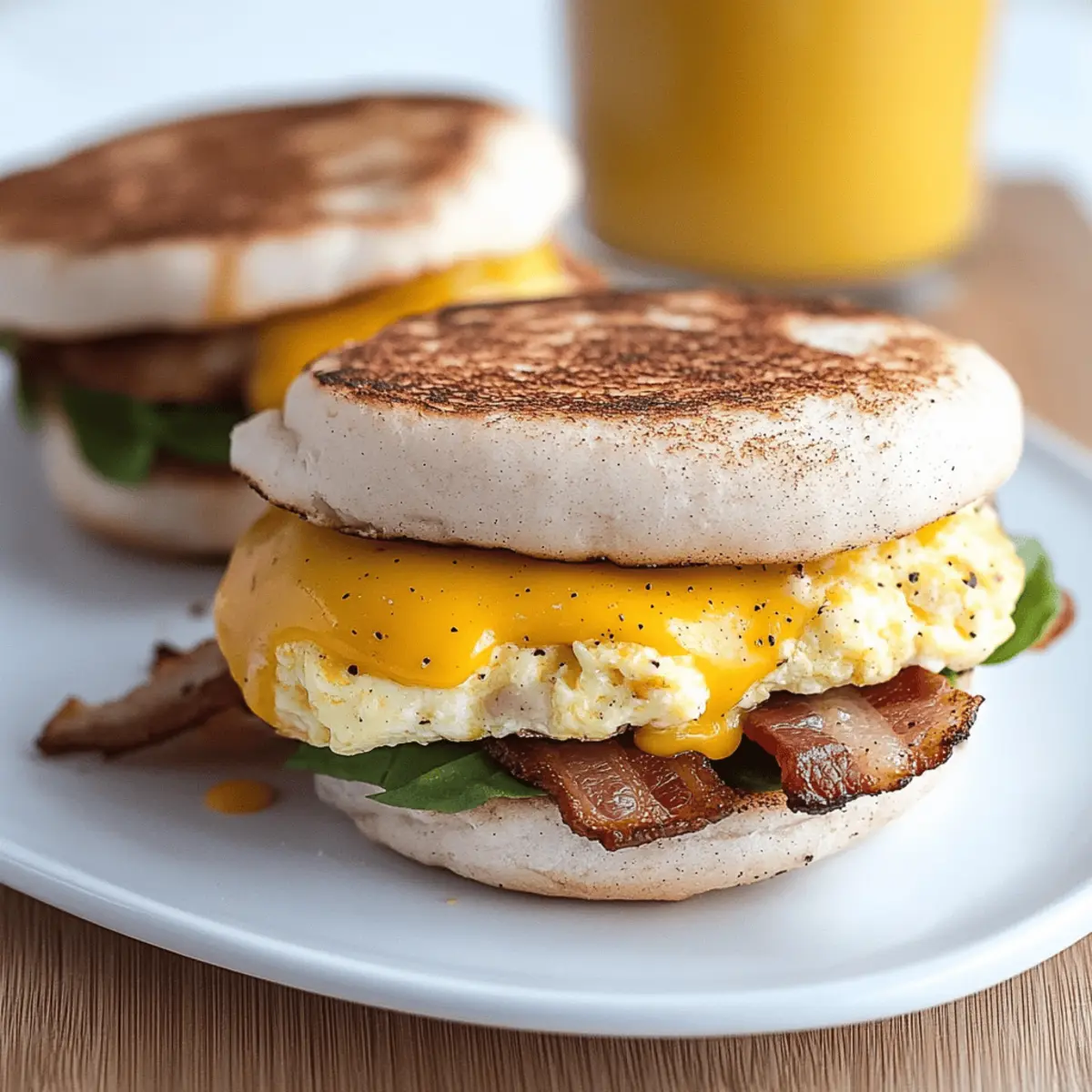 Split the English muffins in half, toasting them lightly if desired. Layer each half with a portion of the baked eggs, a piece of bacon or sausage, and a slice of melty cheese. Feel free to get creative by adding optional ingredients like sautéed spinach or avocado for added flavor and nutrition.
