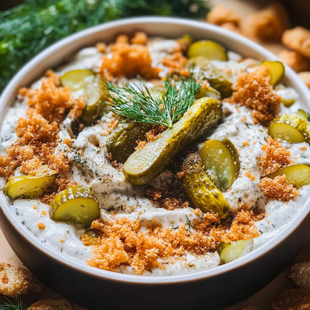 This Fried Pickle and Ranch Dip is perfect for meal prep, allowing you to enjoy more time with family and friends without sacrificing flavor. You can prepare the entire dip up to 24 hours in advance; simply follow all the steps up until chilling. After mixing in the dill pickles, transfer the dip to an airtight container and refrigerate. To maintain its creamy texture and flavor, be sure to keep it tightly covered. When you’re ready to serve, stir in ¼ cup of the toasted breadcrumbs for that delightful crunch and garnish with extra pickles. With this make-ahead tip, you’ll have a delicious dip ready to impress everyone while saving precious time!