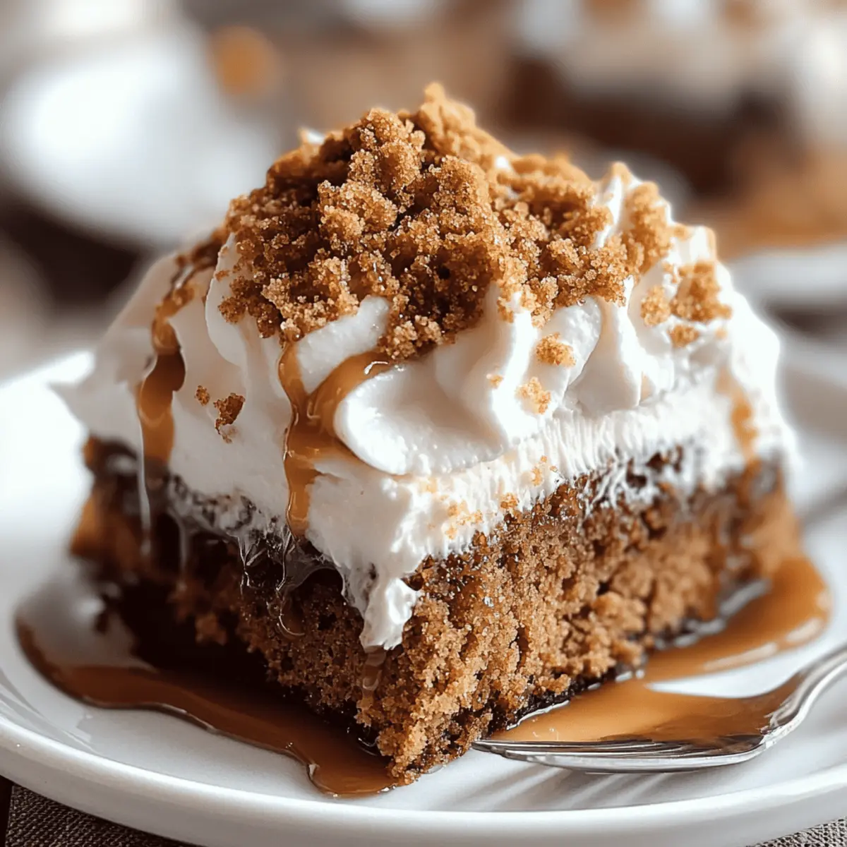 Cover the completed gingerbread poke cake with plastic wrap and refrigerate for at least 1 hour before serving. This chilling time allows the flavors to meld and gives the whipped cream a chance to set. When ready to serve, slice into squares and watch as everyone digs into this delightful, festive dessert!