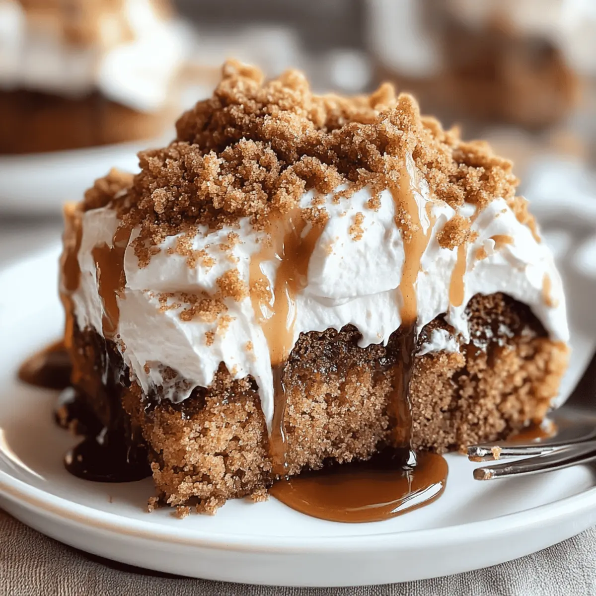 Carefully spread the whipped cream evenly across the top of the cooled gingerbread poke cake. Crushed gingersnap cookies will add the perfect crunch, so sprinkle them generously over the whipped cream layer. This final touch not only adds texture but also a delightful burst of spicy flavor that complements the cake beautifully.