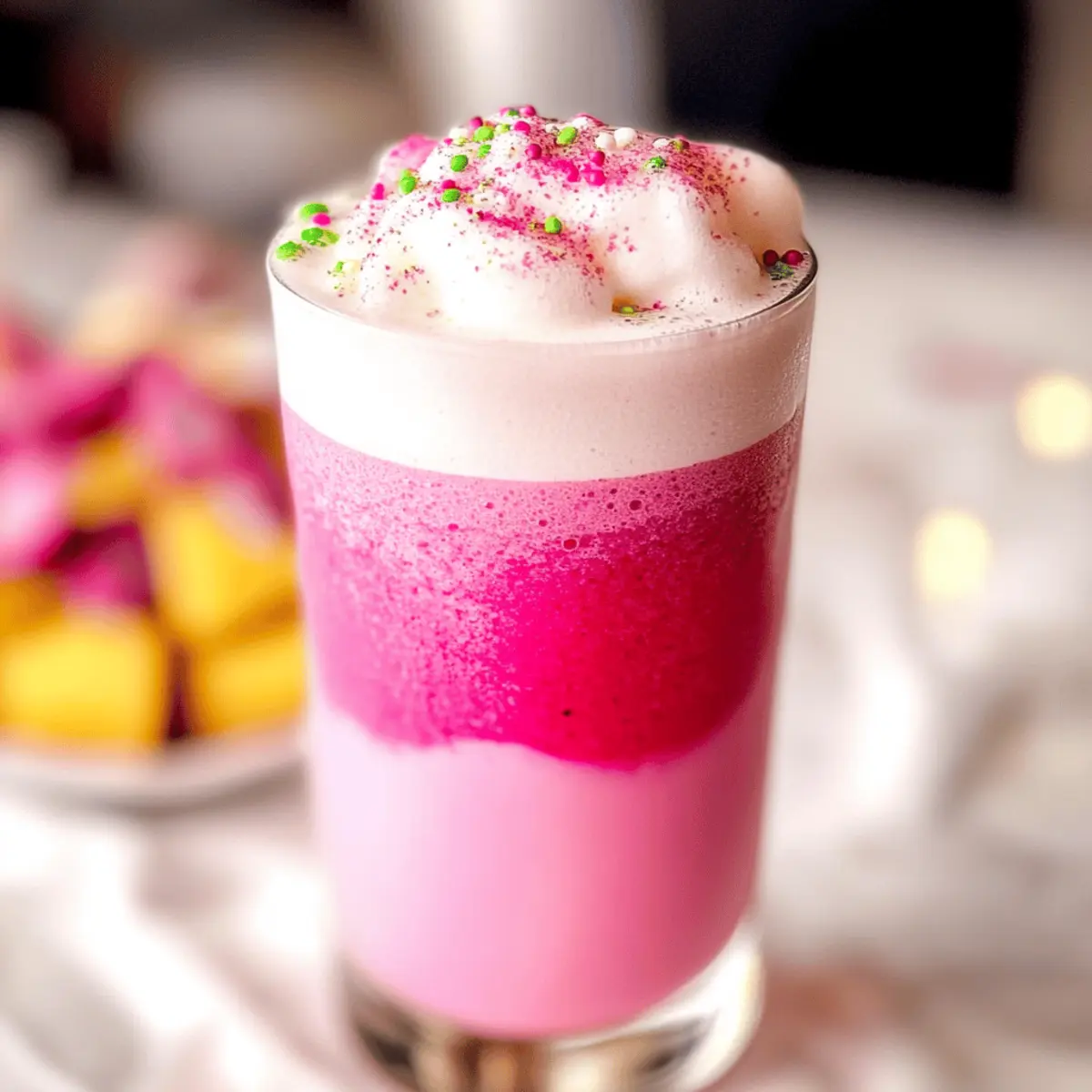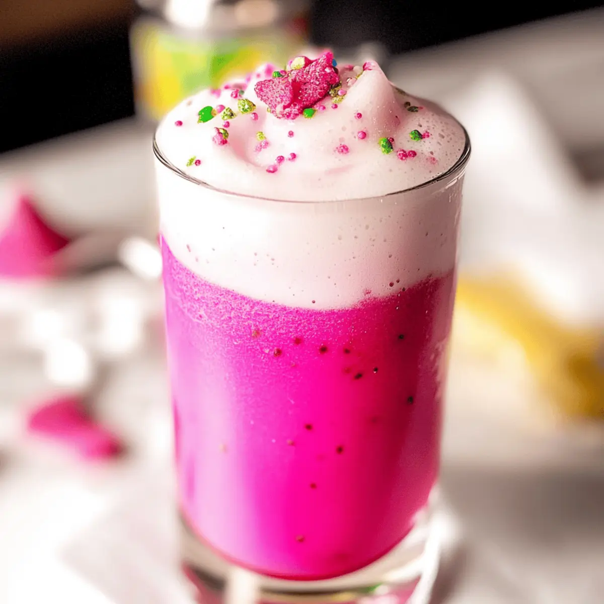 Strain the vibrant refresher mixture into a tall glass filled with ice, ensuring a clear pour that showcases the stunning pink hue. If desired, stir in extra freeze-dried dragonfruit pieces for added texture and visual appeal. Finally, delicately top the drink with the fluffy strawberry cold foam and, for a whimsical touch, sprinkle pink and green sprinkles over the foam to complete Glinda’s Pink Potion masterpiece.