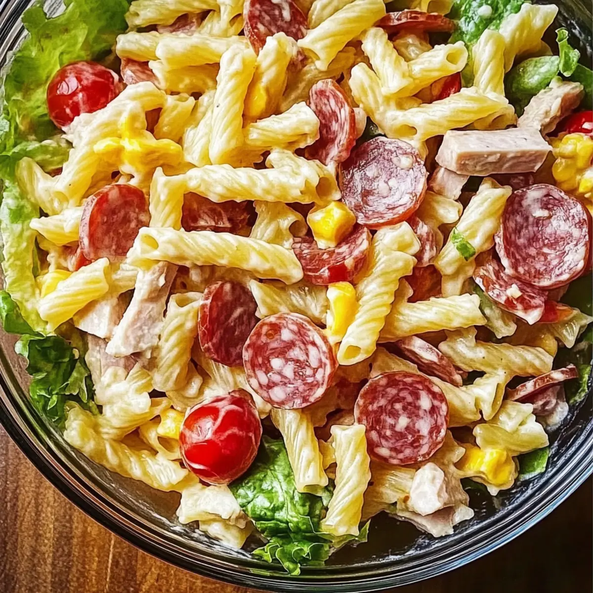 3. In a large mixing bowl, add the cooled pasta along with the chopped meats, cheese, and vegetables. Drizzle the creamy Italian dressing over it and toss gently until well combined.