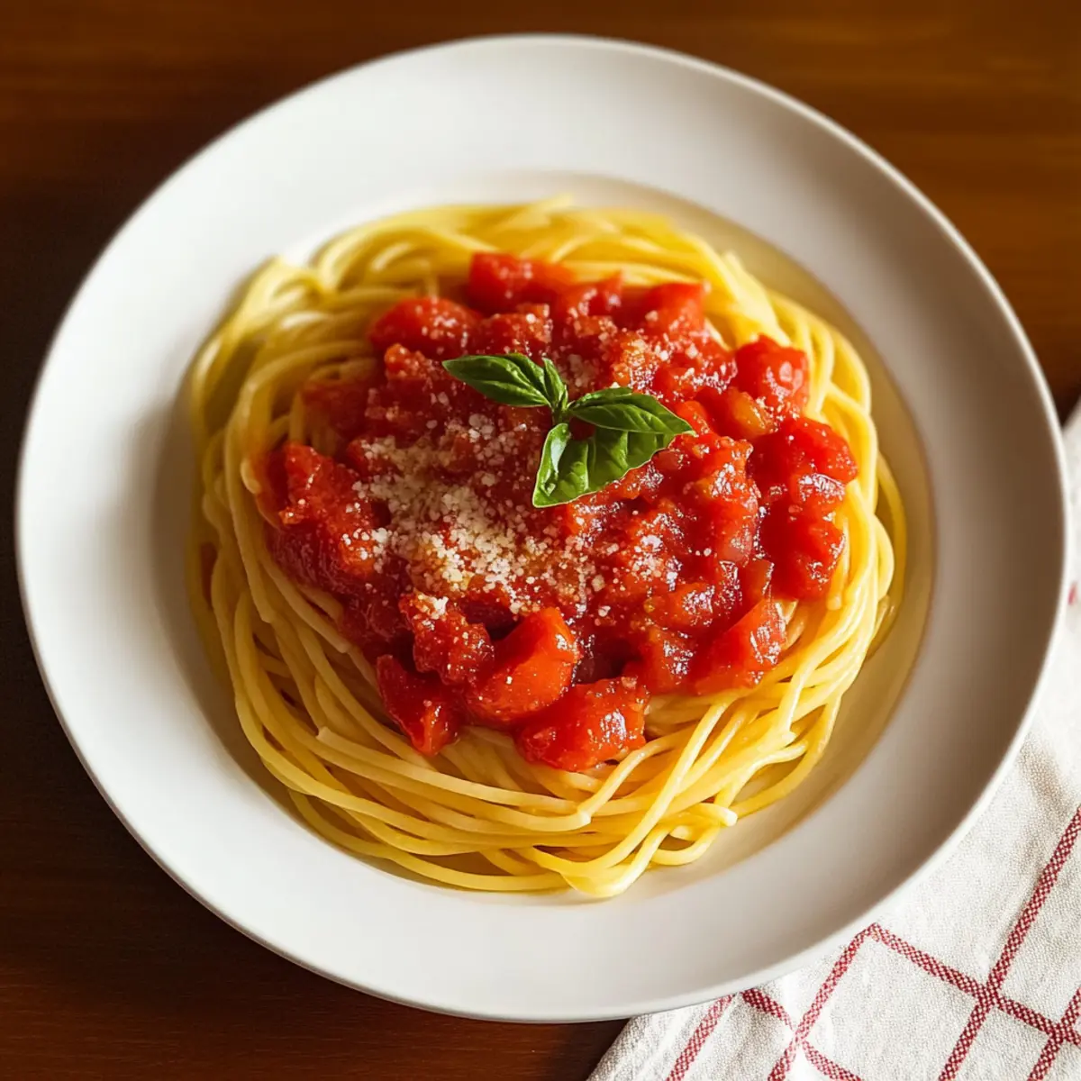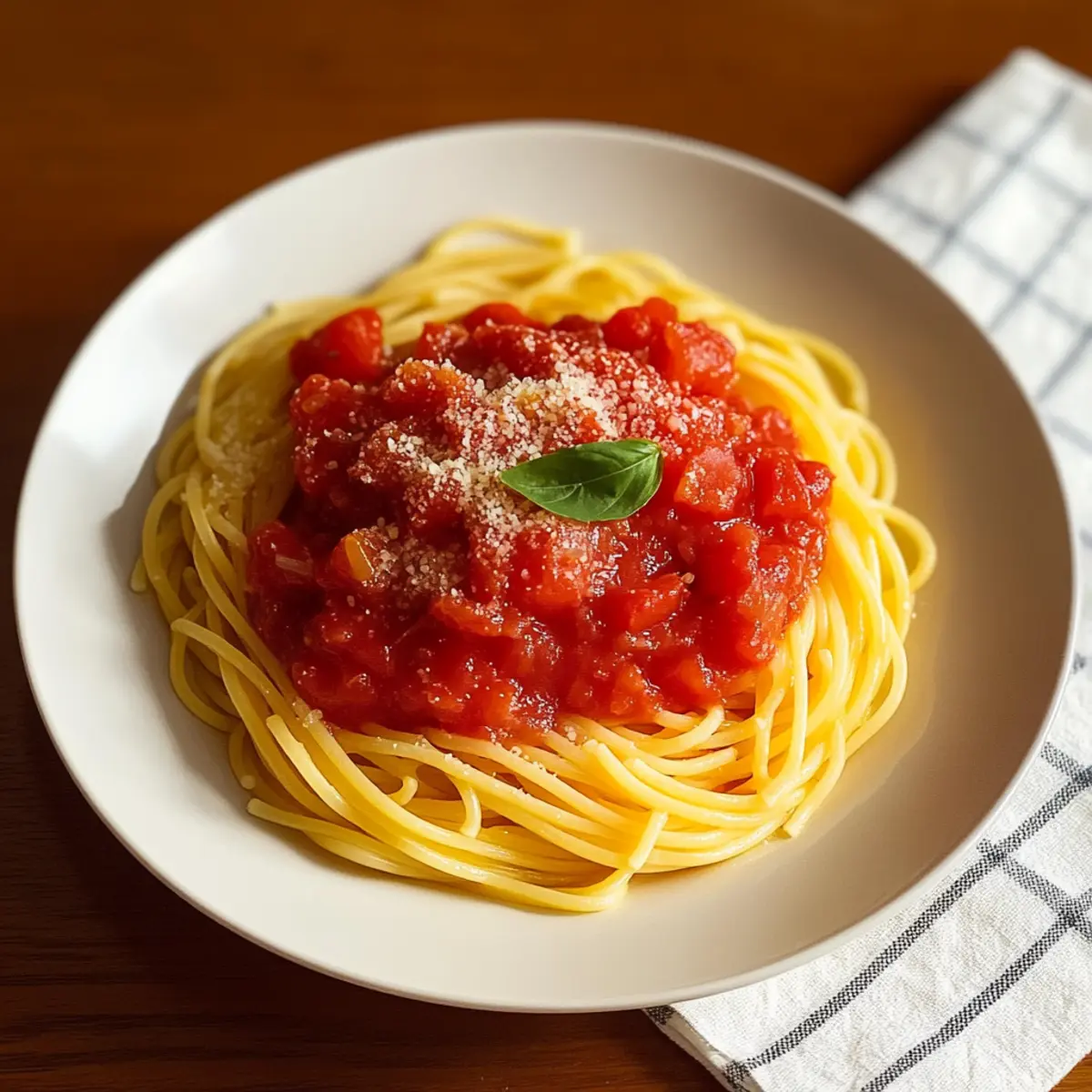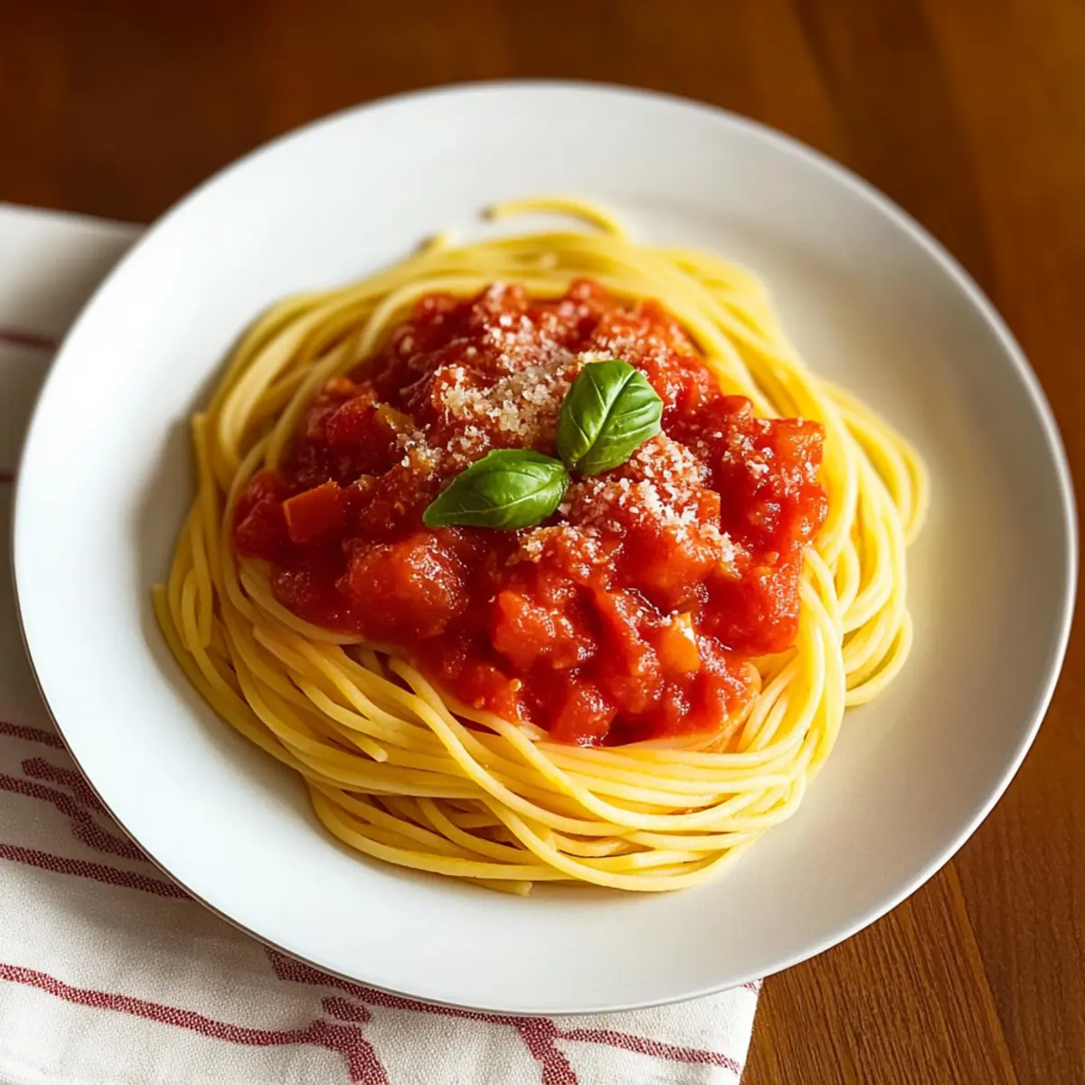 To serve, take the drained spaghetti and add it directly to your saucepan with the classic fresh tomato sauce. Gently toss the pasta in the sauce until every strand is beautifully coated and vibrant. Share this satisfying dish immediately on warm plates, and finish with a generous sprinkle of grated Parmesan cheese for that extra touch of flavor and richness.