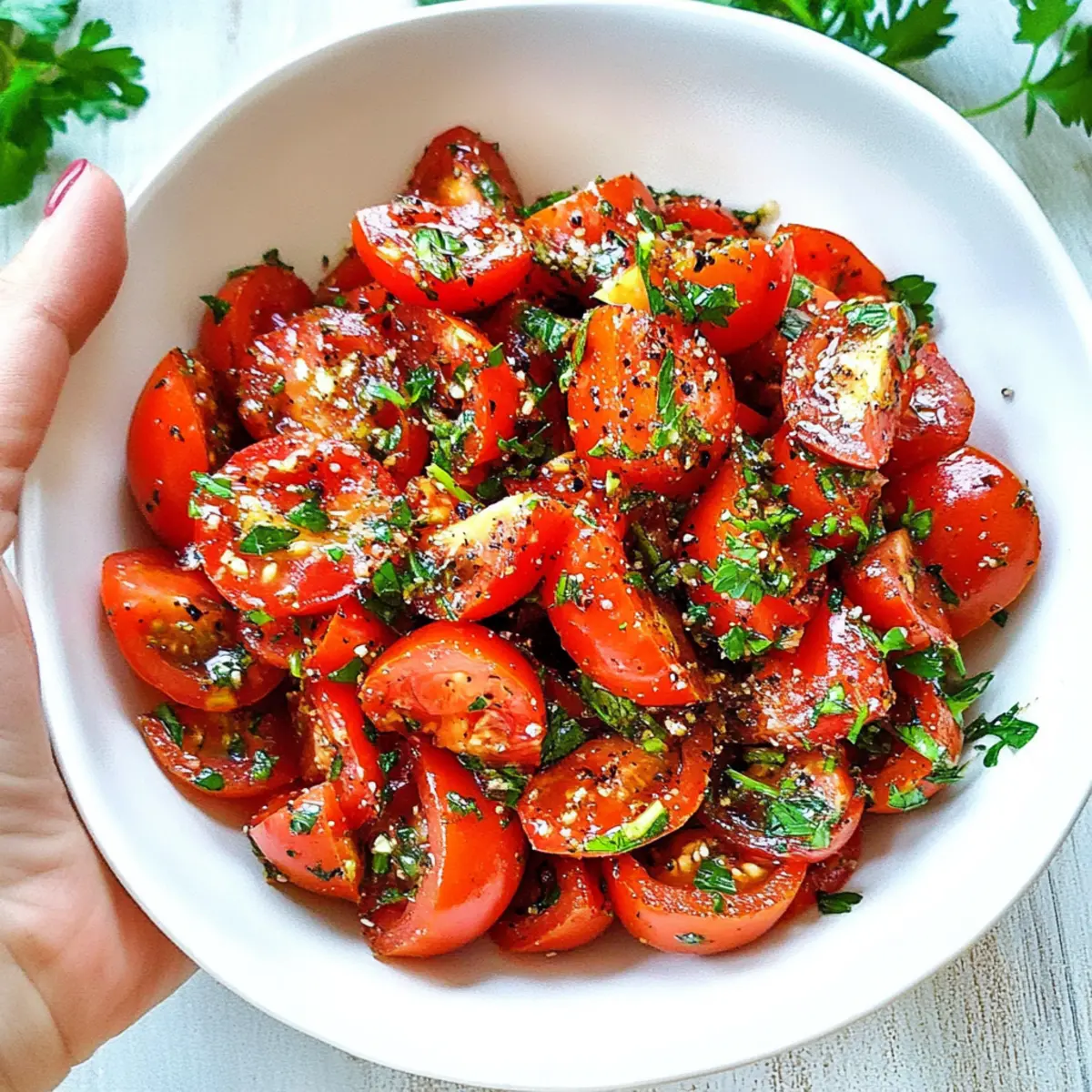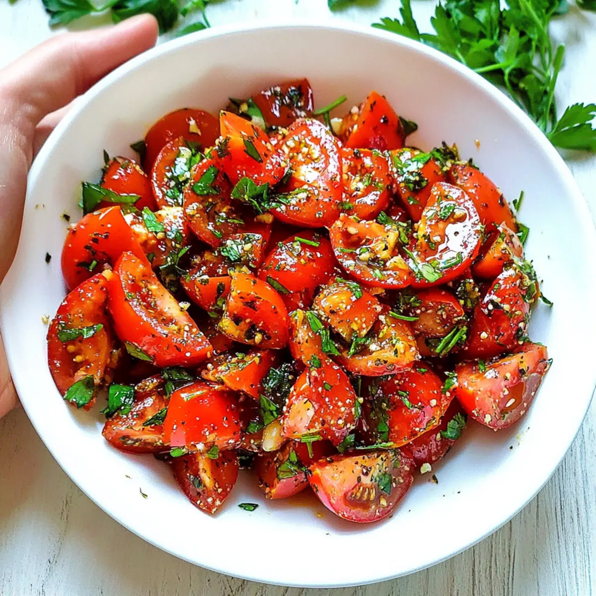 4. Step 4: Combine and Chill - Pour the dressing over the tomatoes, mix gently, then stir in chopped parsley and chill for 30 minutes.