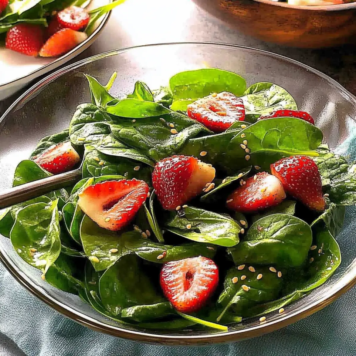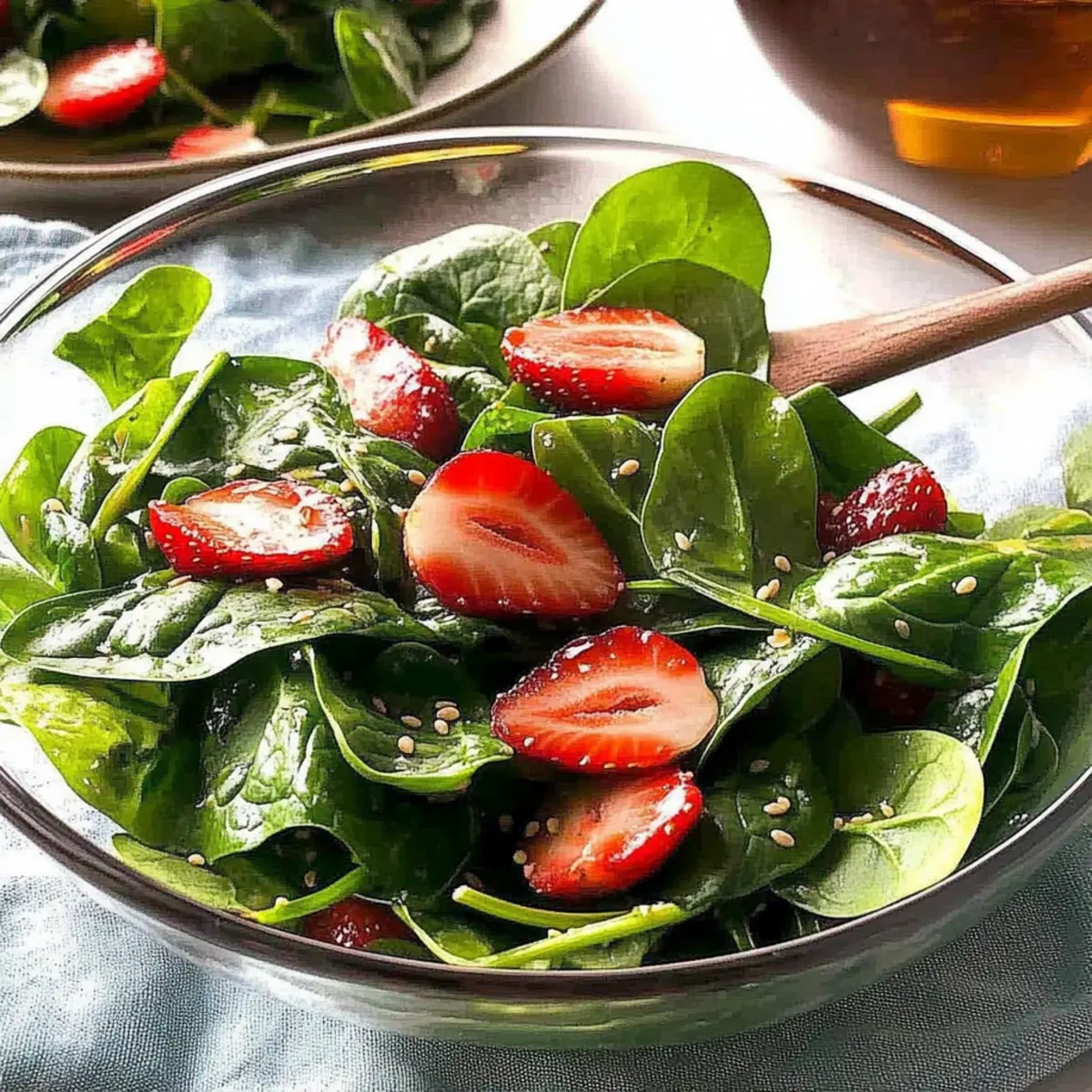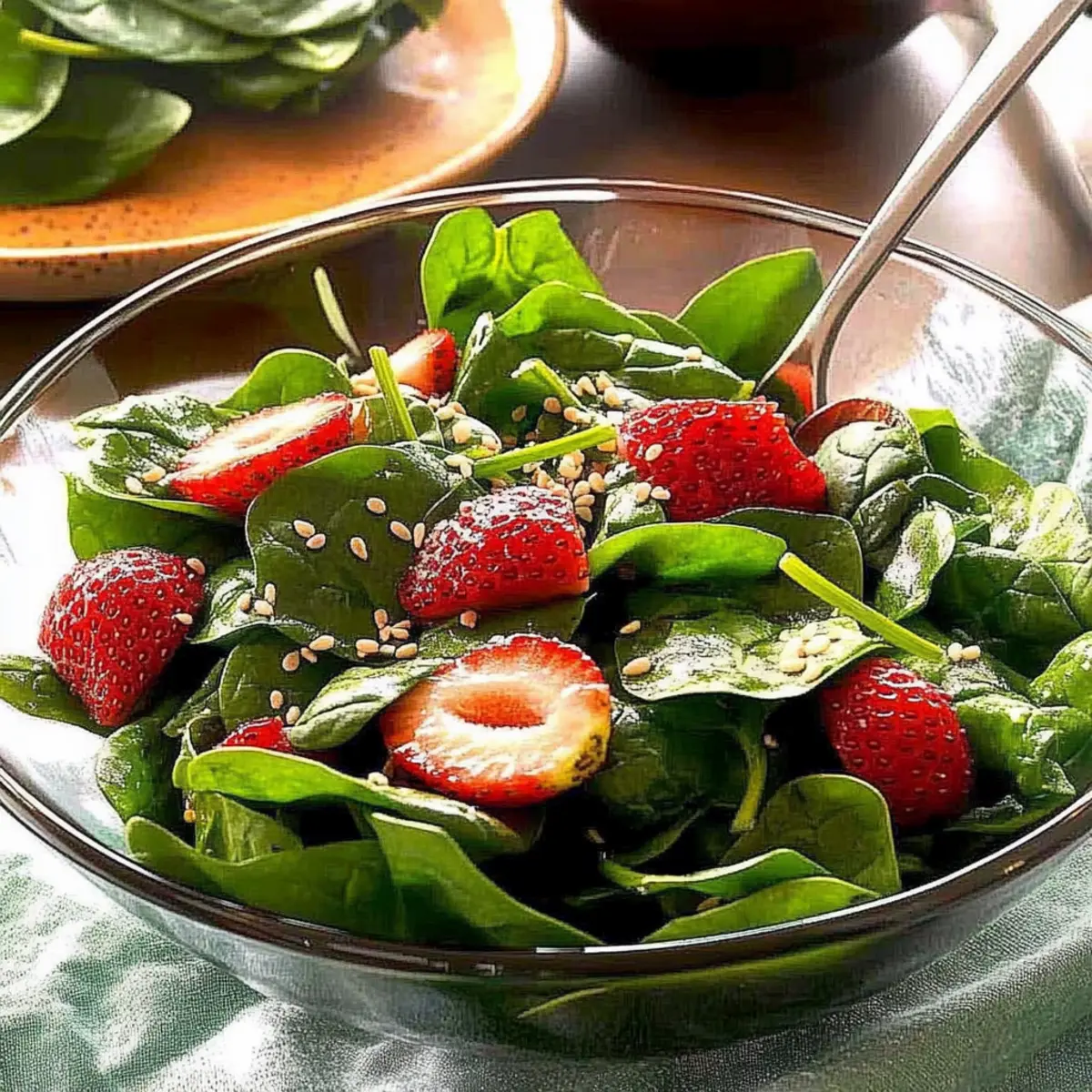 - Add sliced strawberries and toasted sesame seeds to the spinach, pour dressing over, and toss gently to combine.