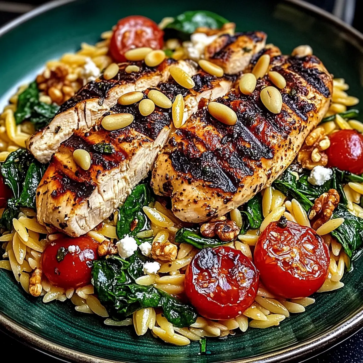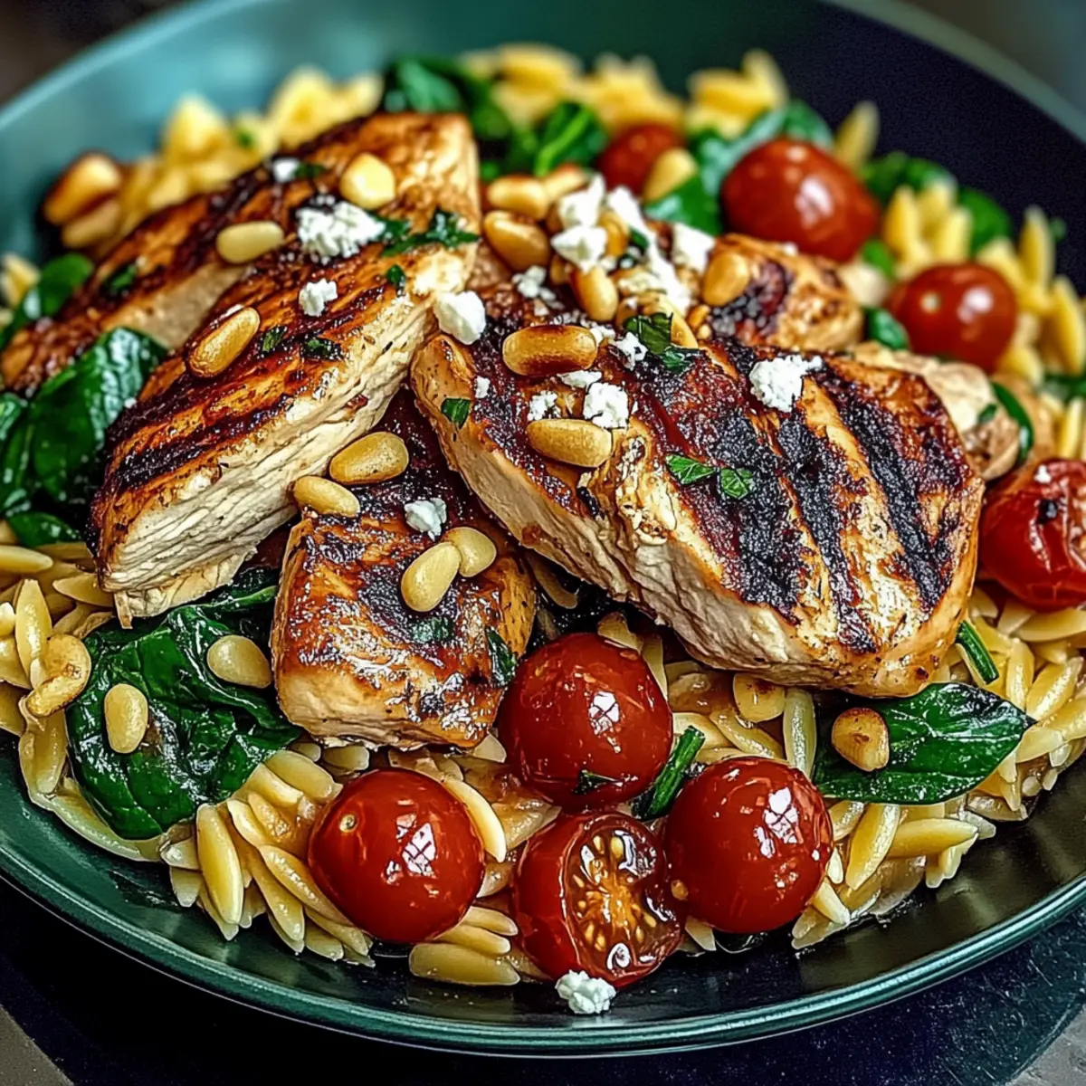 Slice the cooked chicken into strips and arrange it atop the vibrant orzo mixture in the pan. Let everything meld for another couple of minutes on low heat. If desired, sprinkle feta cheese over the top for an extra burst of flavor. Your Mediterranean Chicken and Orzo is now ready, so serve it warm with love and appreciation for a delightful meal.