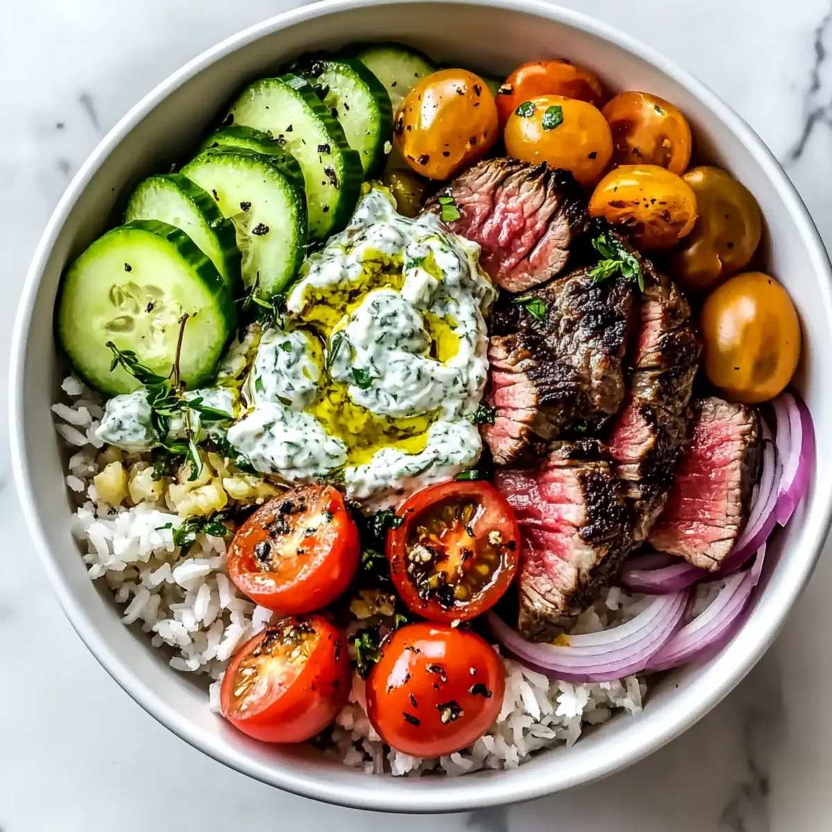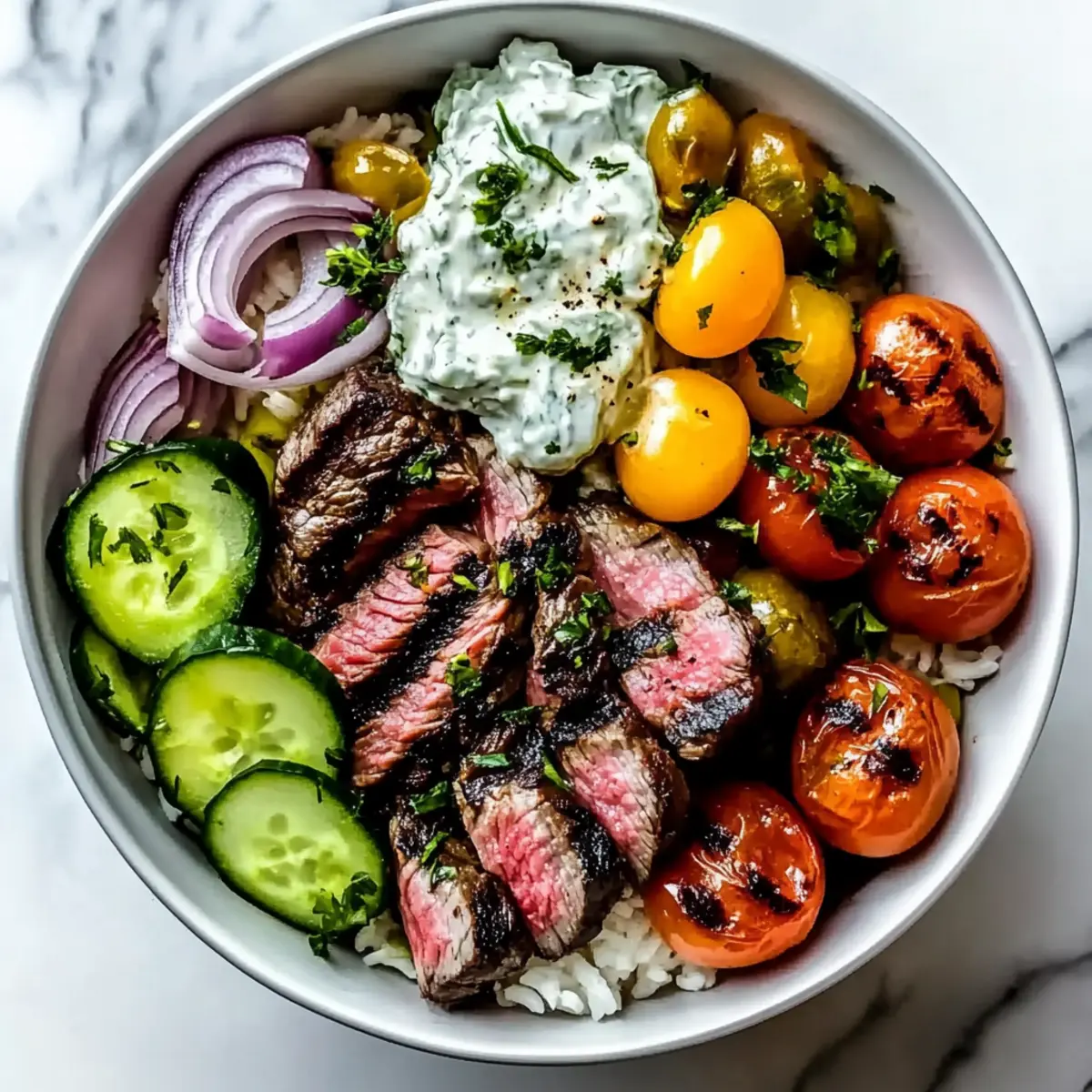 - Assemble the Bowl: Start with a base of cooked grains, layer sliced steak, add toppings, and drizzle with tzatziki and vinaigrette.