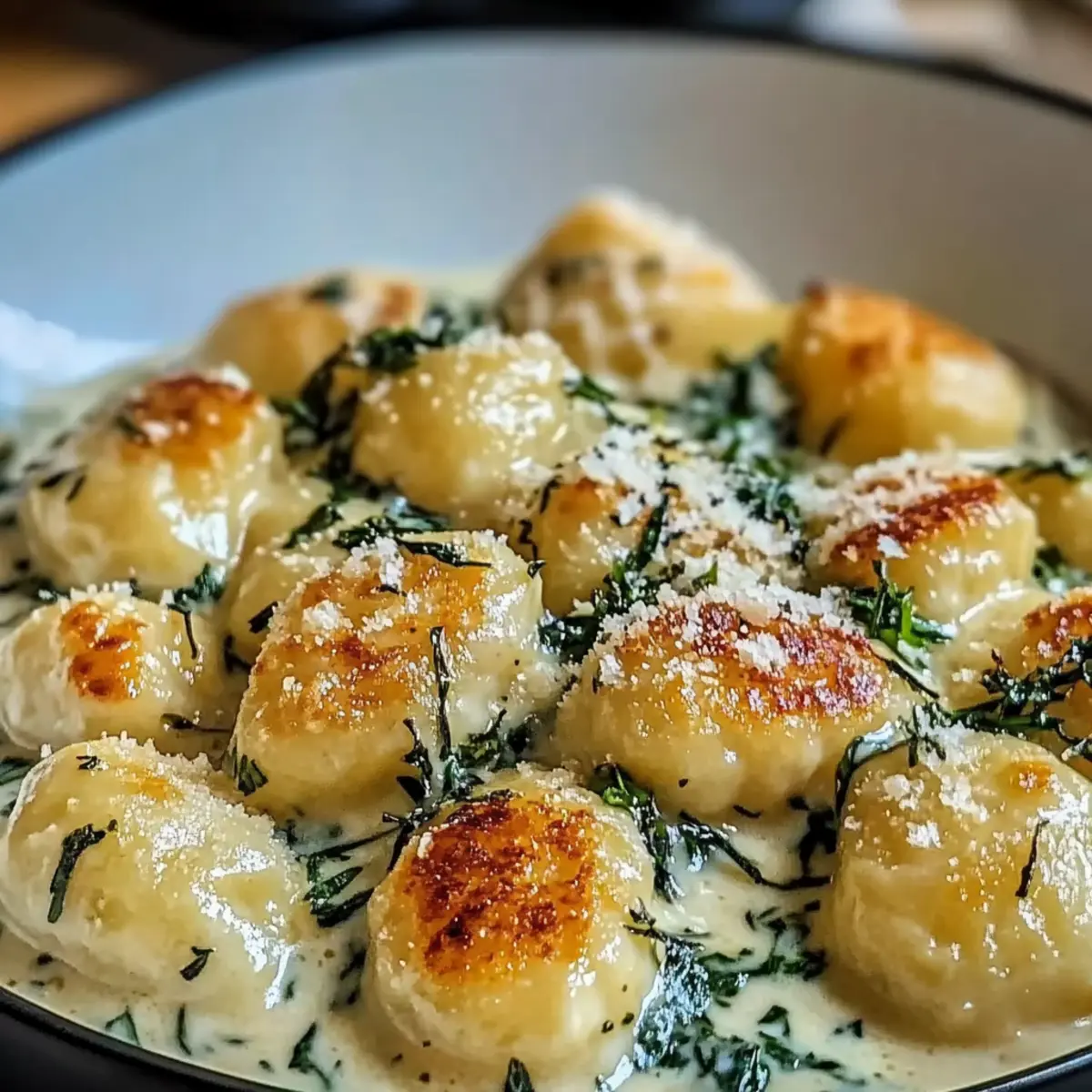 6. Plate the Millionaire Gnocchi with Creamy Sauce, drizzling any excess sauce over the top and garnishing with additional Parmesan or herbs.