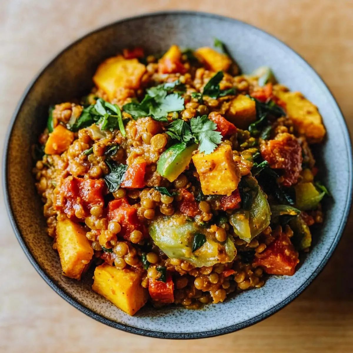 Cover the skillet and let your One-Pan Vegetarian Dinner simmer for about 25-30 minutes, stirring occasionally. Keep an eye on the mixture; the lentils and sweet potatoes should be tender and fully cooked. If necessary, add more broth or water to achieve your desired consistency during this cooking phase.