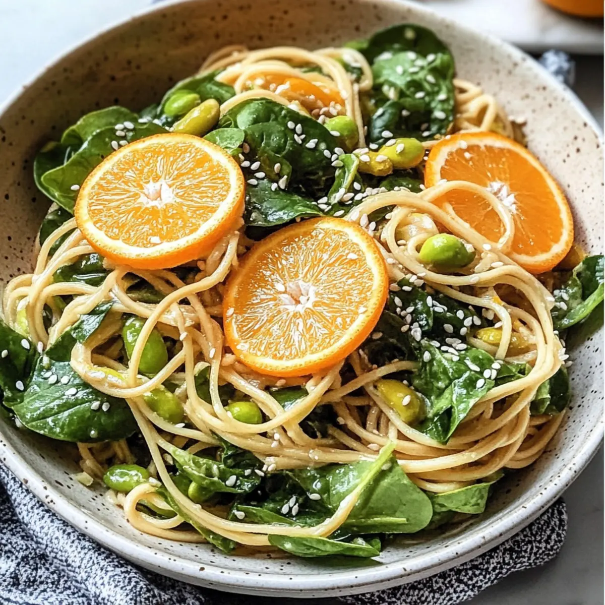 - In a large mixing bowl, combine the cooled spaghetti, baby spinach, oranges, pepitas, and sesame seeds. Toss gently until evenly mixed.