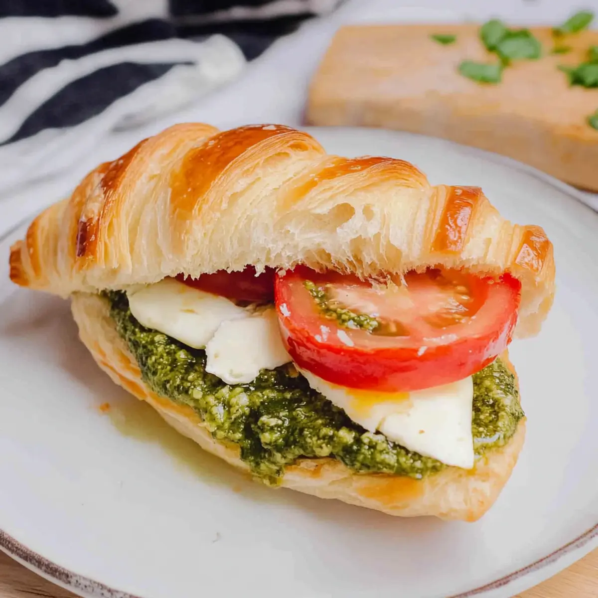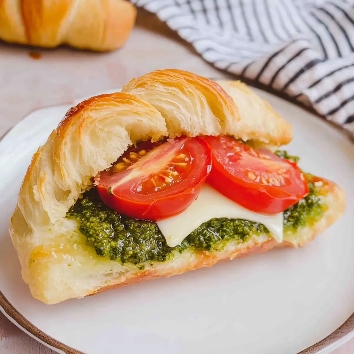 Serving Tip: Always let it cool slightly before serving to enhance the flavors and textures of this delightful Pesto, Tomato, Brie Croissant Sandwich.