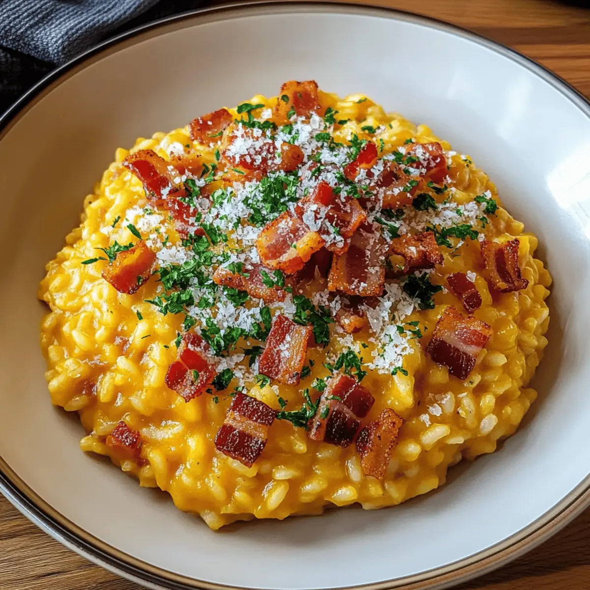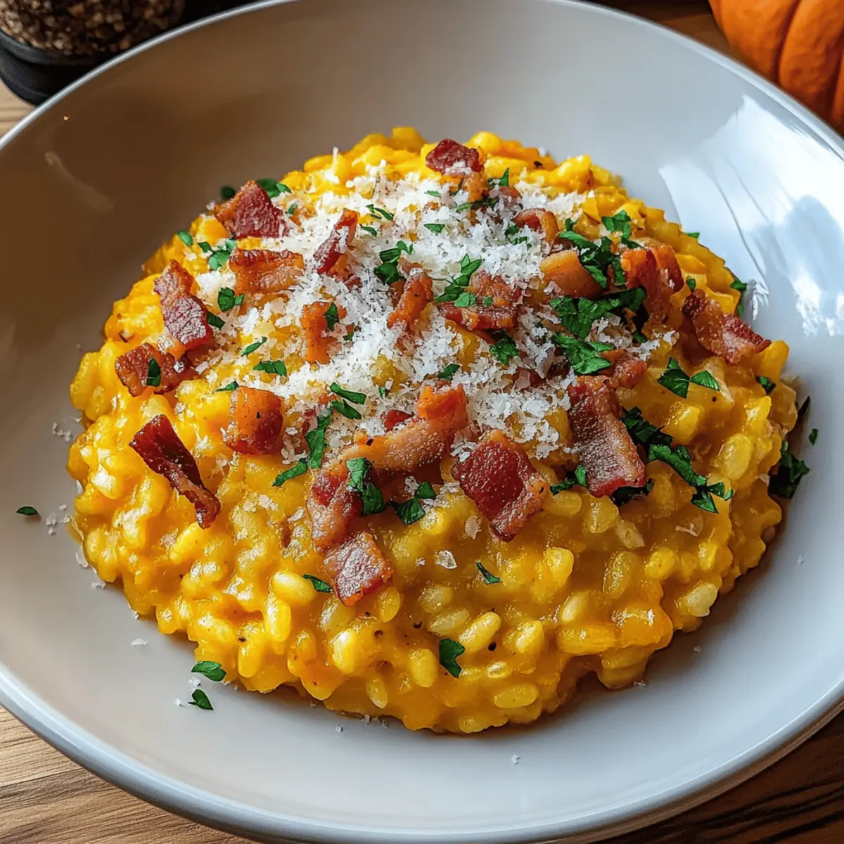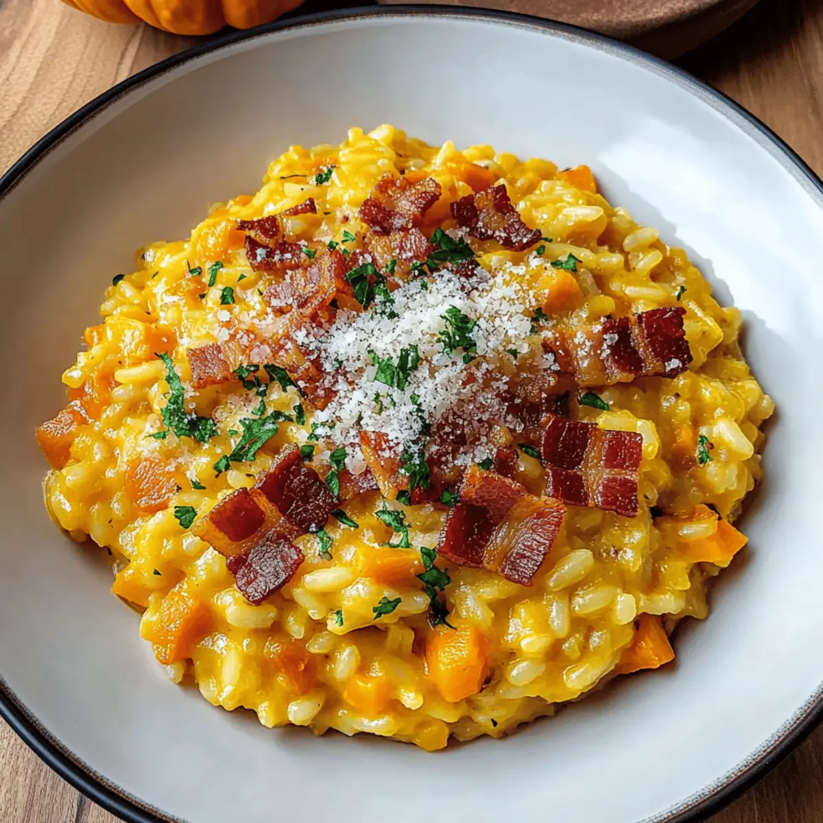 This Pumpkin Risotto with Bacon & Parmesan is a creamy, comforting dish perfect for any occasion.