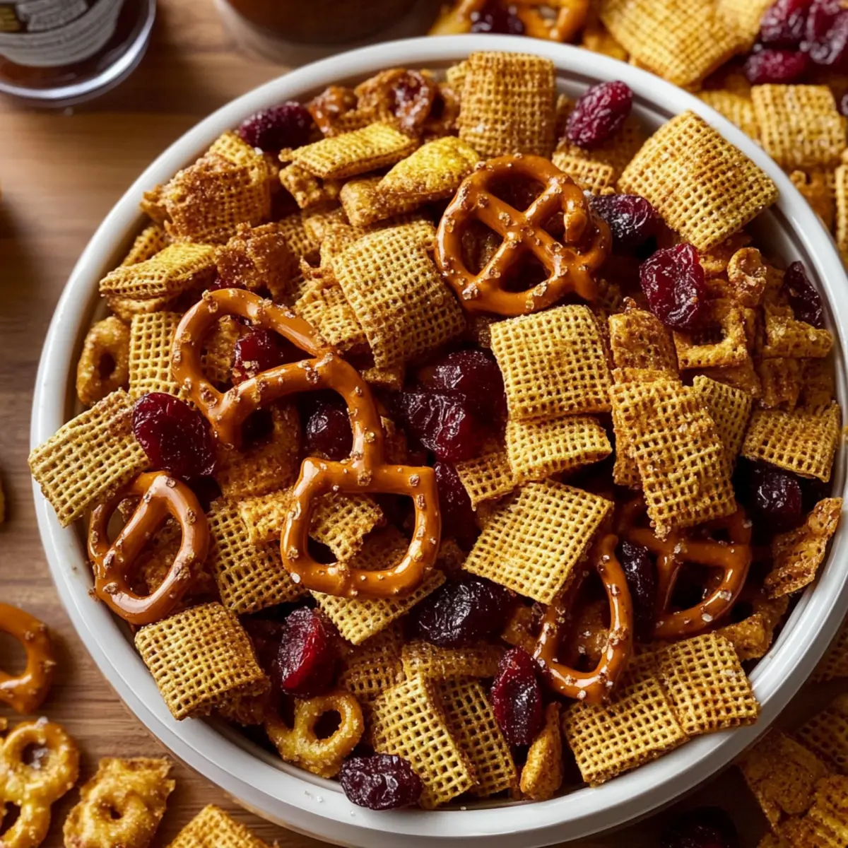 - In a large mixing bowl, combine the base ingredients (Rice Chex, Wheat Chex, pretzel sticks, pecans, dried cranberries) and gently stir until mixed.