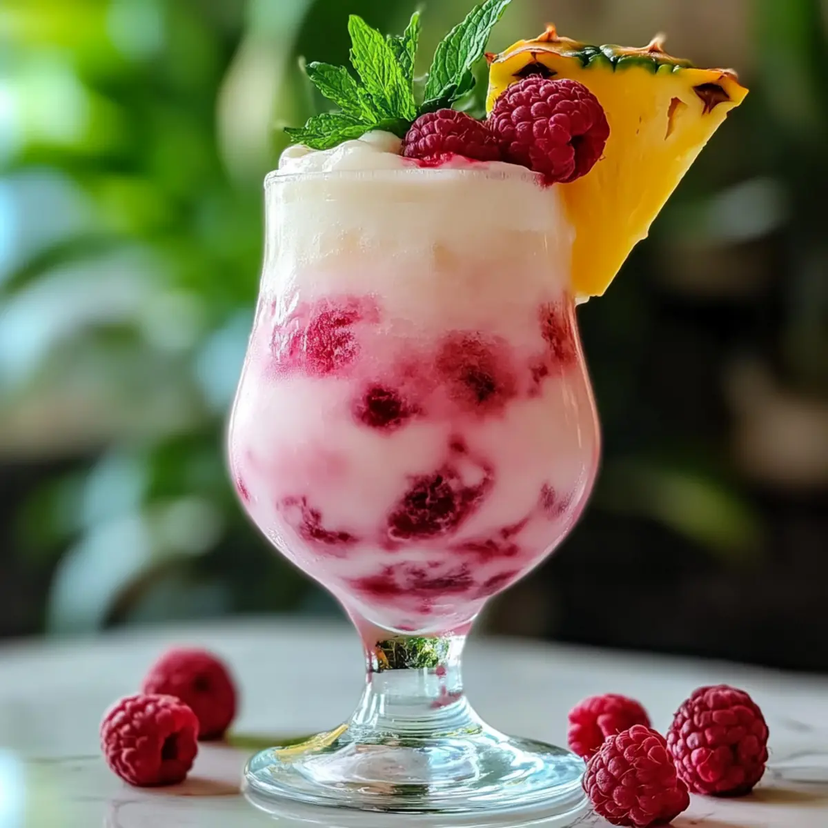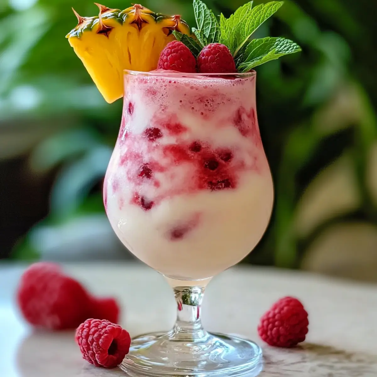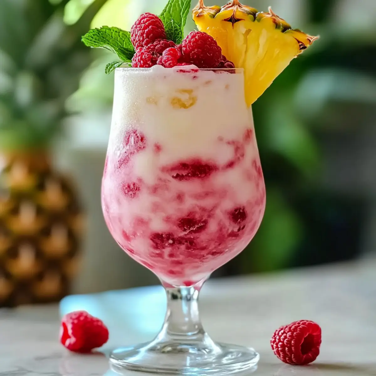 4. Pour the mixture into the chilled glass and garnish with fresh raspberry, mint sprig, and pineapple wedge. Serve immediately.
