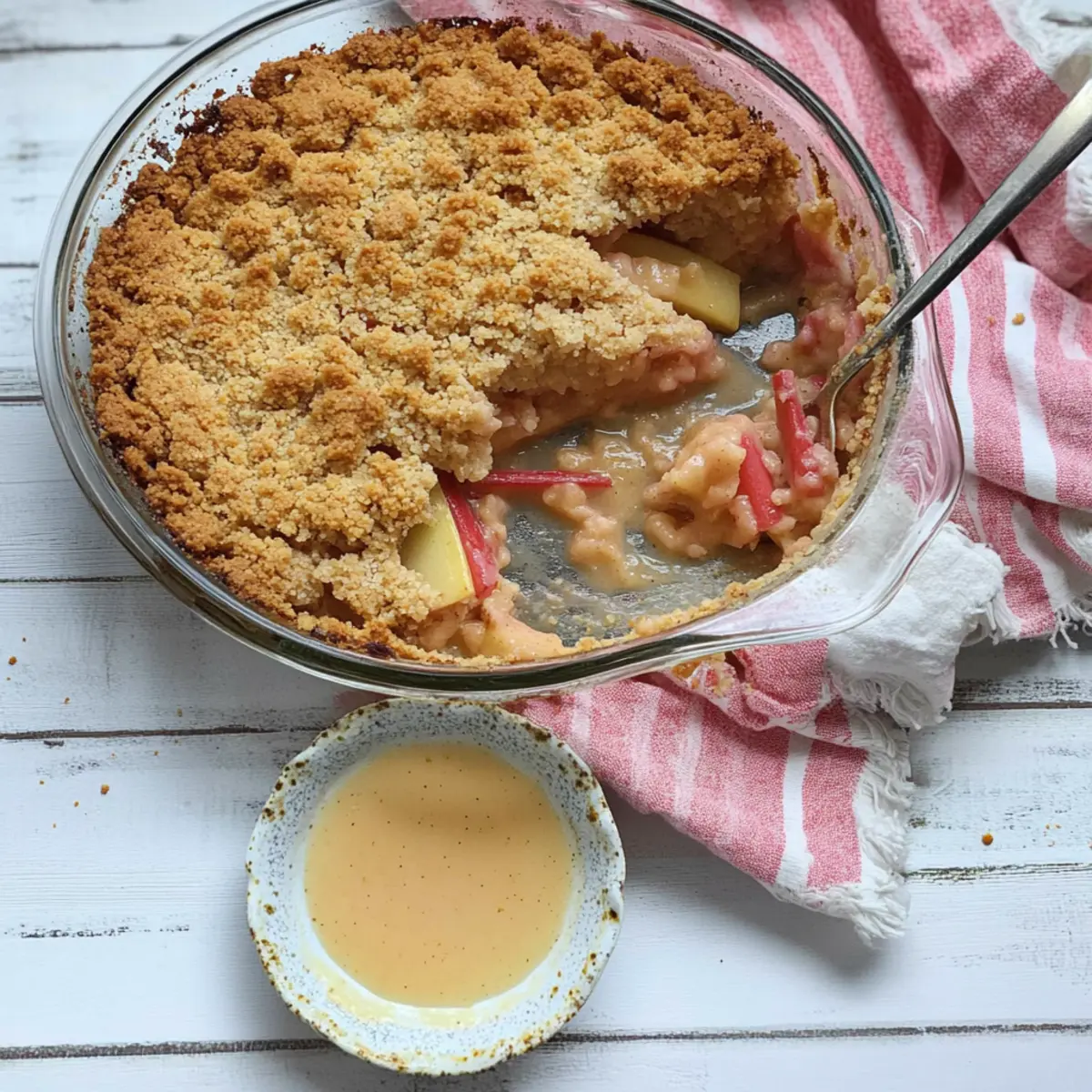 • Custard: A warm pour of smooth custard adds creamy richness, balancing the fruit’s tartness and enhancing the comforting vibes of the crumble.