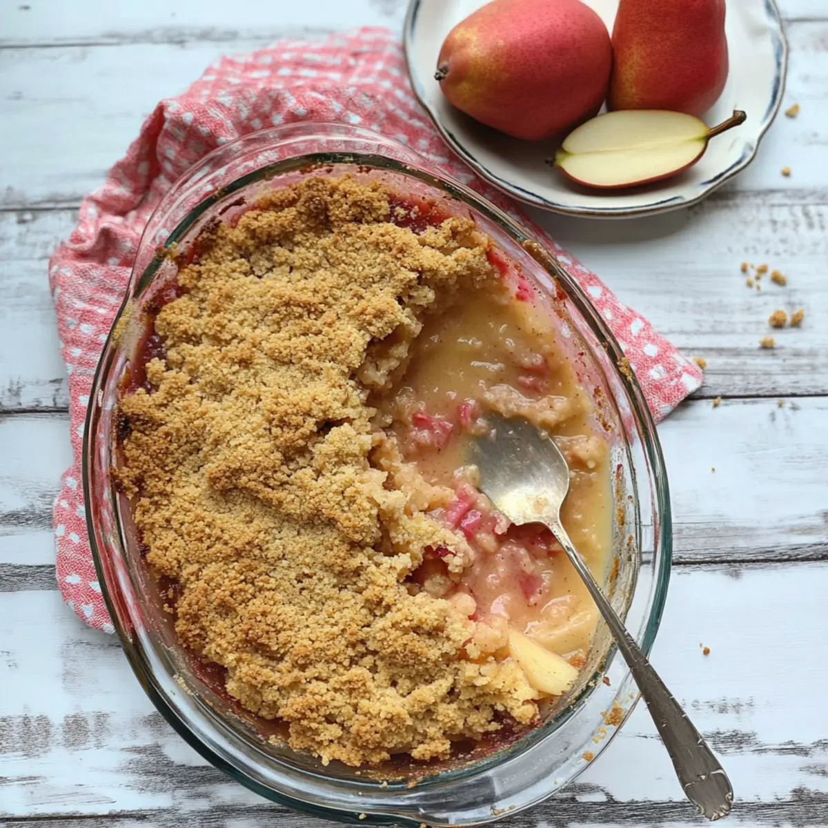 • Fruit Swap: Use apples or plums instead of rhubarb and pears for different flavor profiles. Each fruit brings its unique sweetness and acidity, making every crumble a new experience!