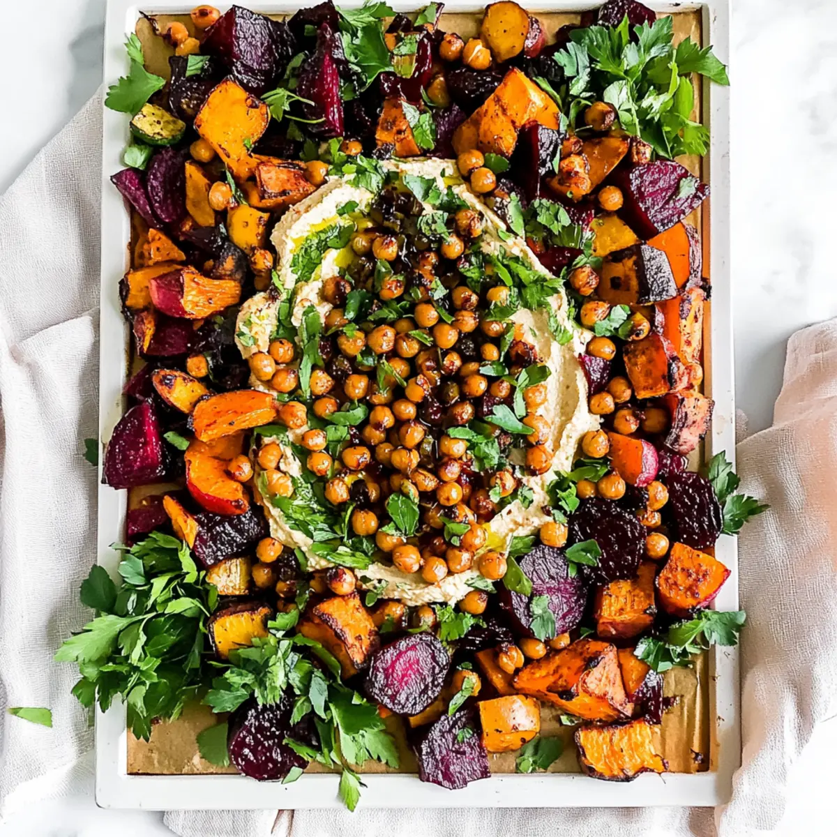 - Spread hummus on a serving board, arrange roasted veggies and crispy chickpeas on top.