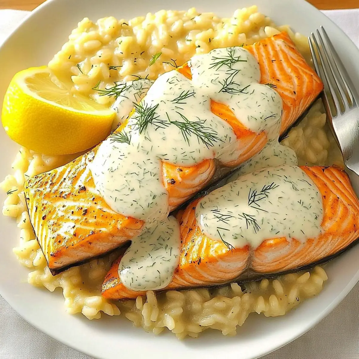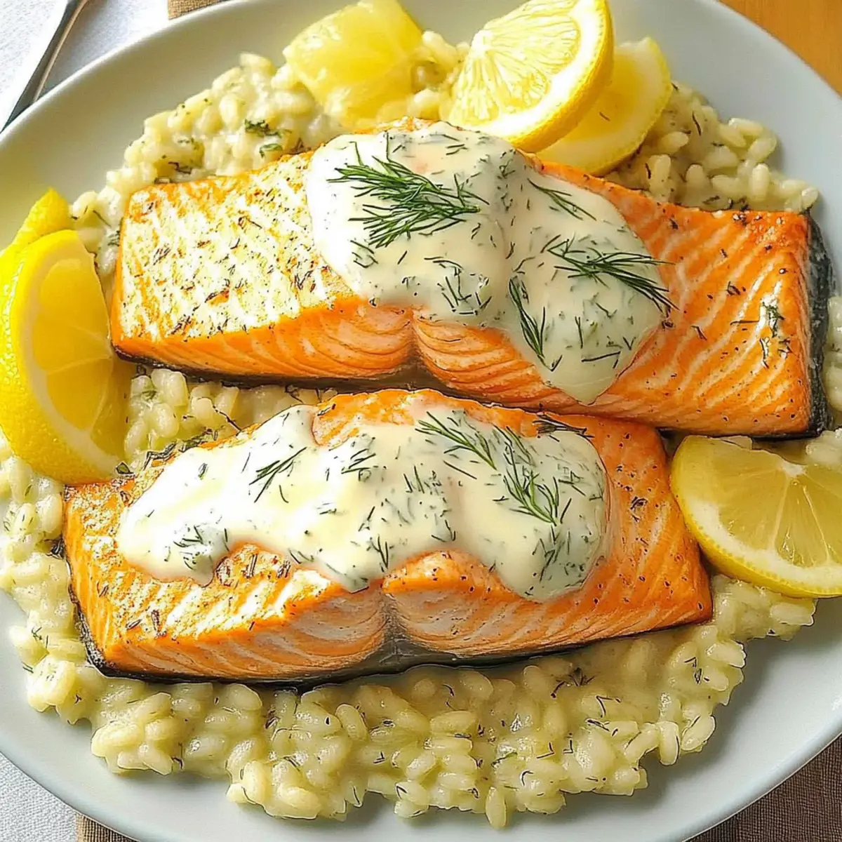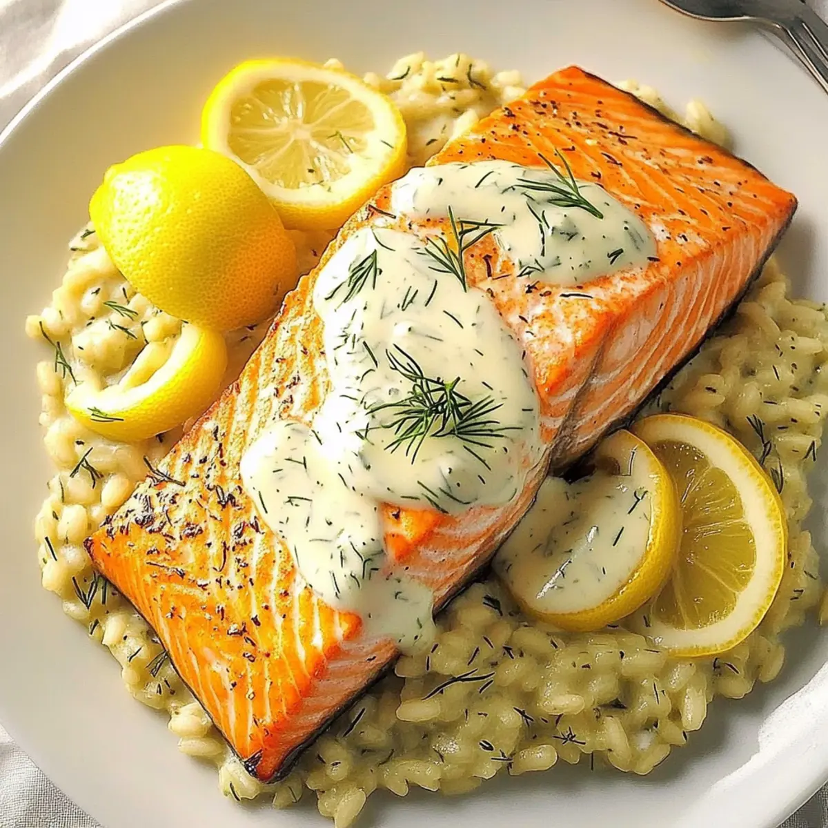 - Plate salmon with lemon risotto and drizzle with creamy dill sauce. Garnish with fresh dill if desired.