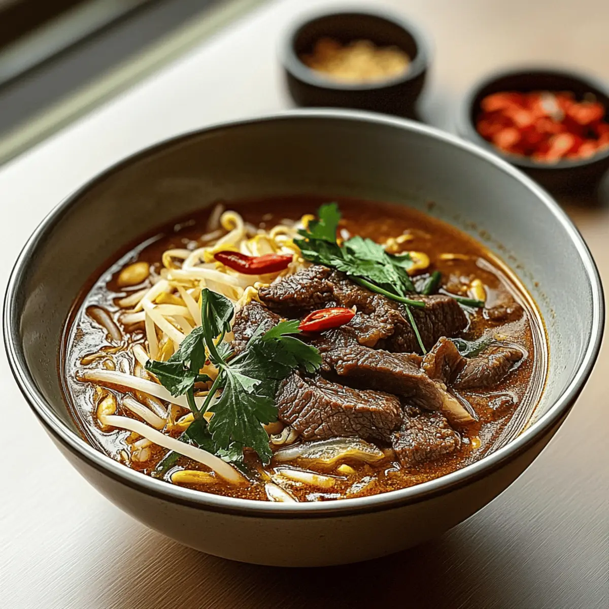 - Serve: Ladle the Satay Beef Noodle Soup into bowls, garnishing with bean sprouts, cilantro leaves, lime juice, and optional diced red chili. Serve immediately.