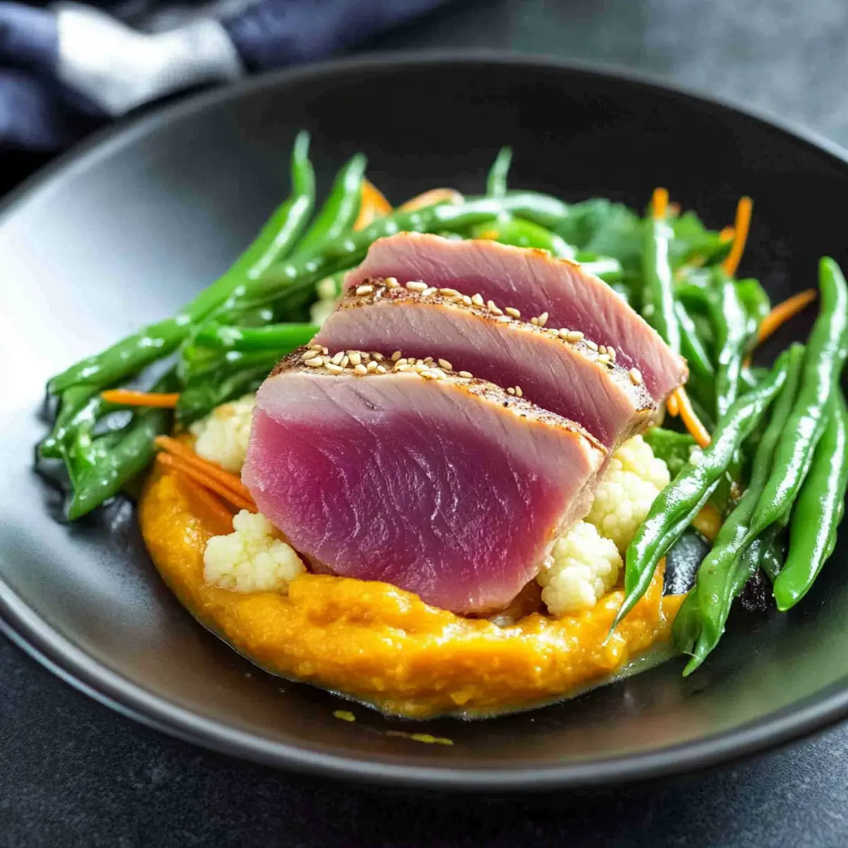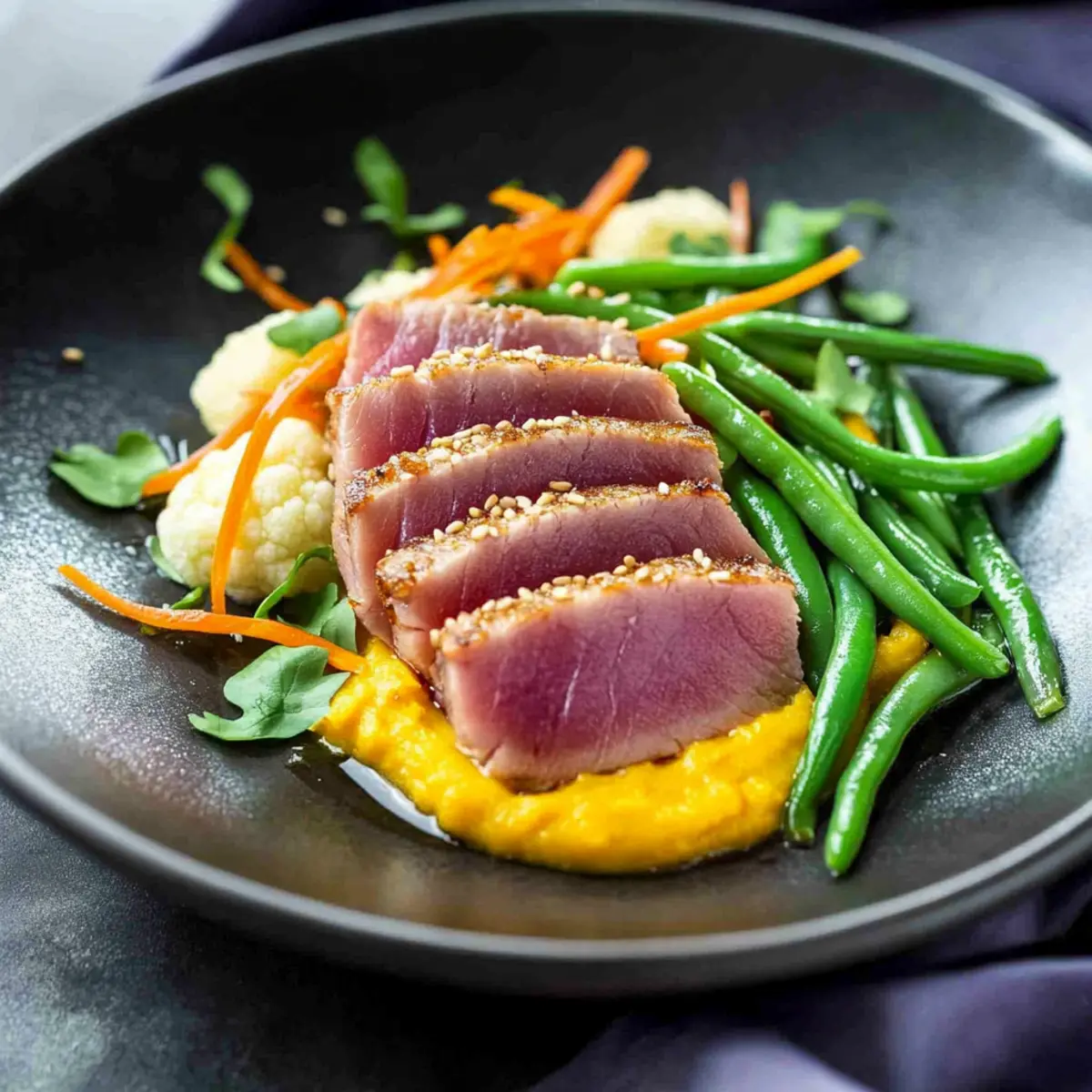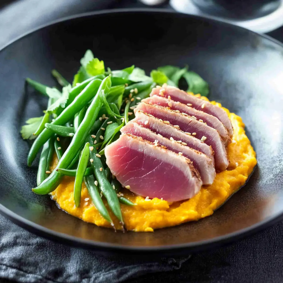 - Serve: Place a scoop of puree on each plate, add the seared tuna, and arrange the green beans beside it.