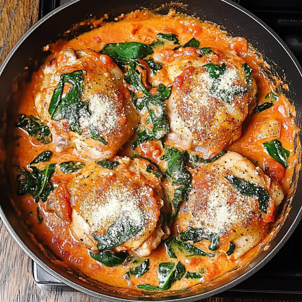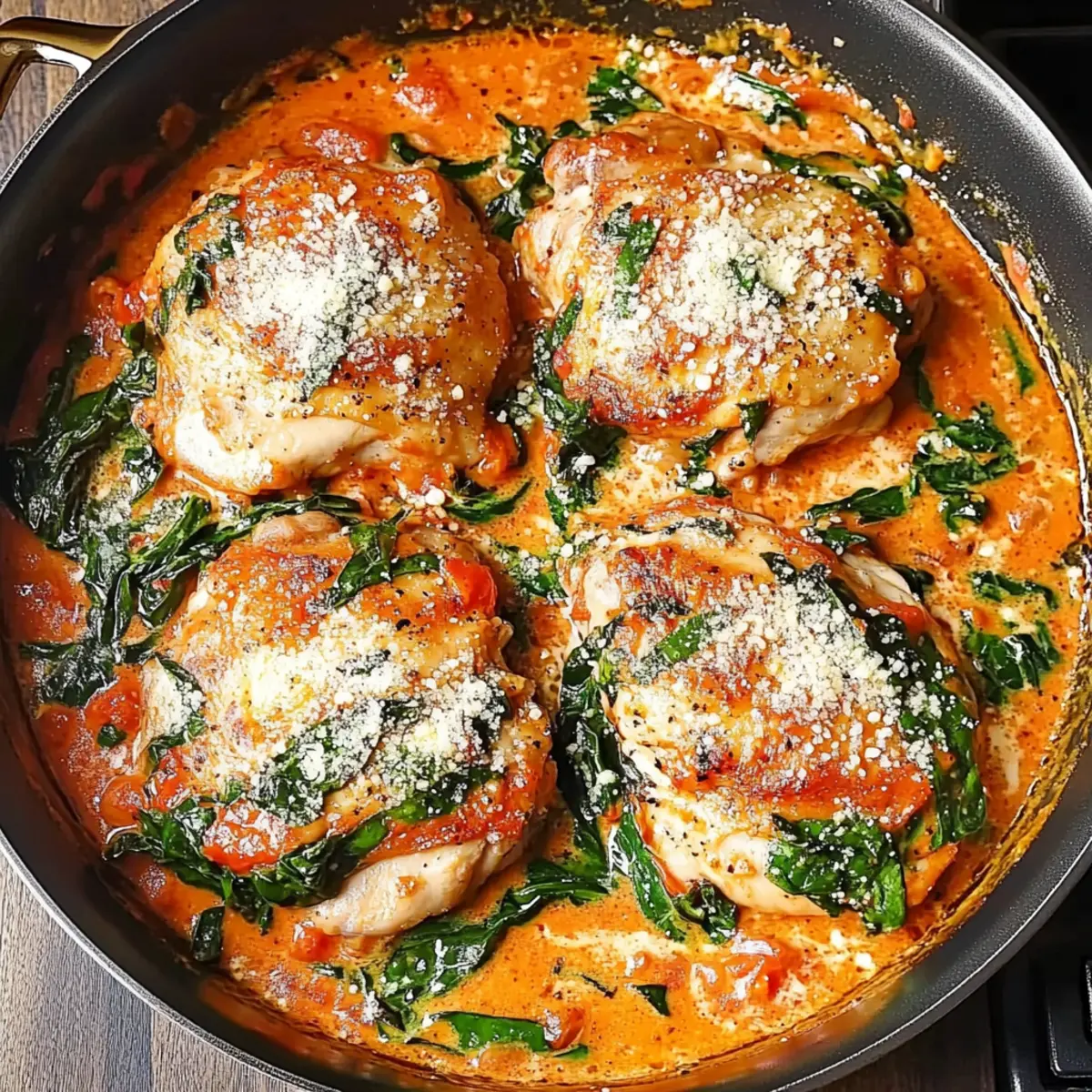 These Skillet Chicken Thighs with Creamy Tomato Basil Spinach Sauce are perfect for meal prep enthusiasts! You can season and sear the chicken thighs up to 24 hours in advance, placing them in an airtight container in the fridge to keep them fresh and flavorful. Additionally, you can prepare the creamy tomato sauce—just combine the tomato sauce, garlic, and cream, then refrigerate it separately (this prevents the cream from curdling). When you’re ready to serve, simply sautĂ© the wilted spinach and basil in the sauce, return the chicken to the skillet, and heat everything together until warmed through. This way, you’ll enjoy restaurant-quality results with minimal effort during busy weeknights!