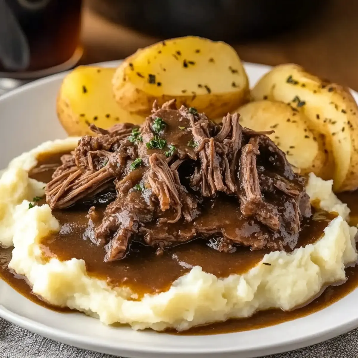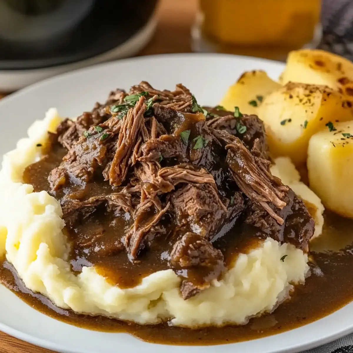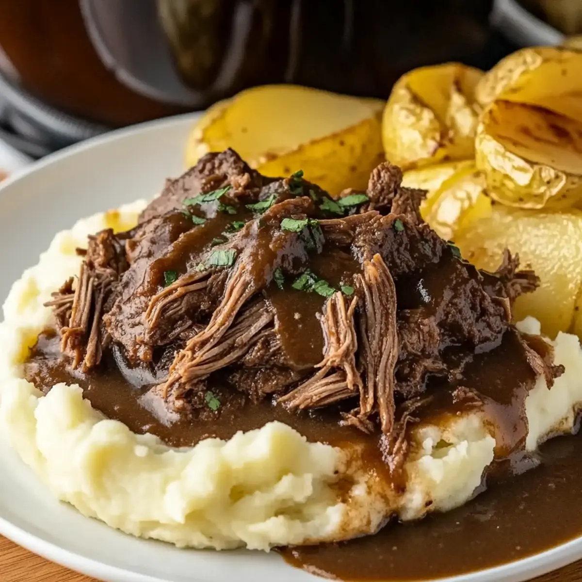 6. Step 6: Shred beef, serve with mashed potatoes and gravy, and enjoy!