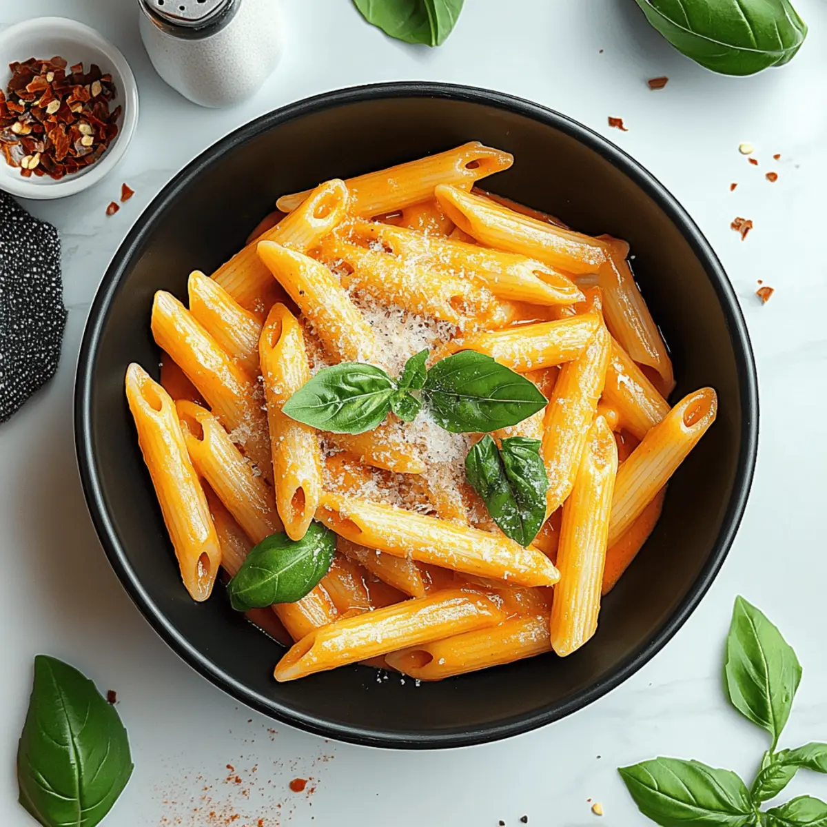 Dish out your creamy spicy vodka pasta into bowls, topping each serving with grated Parmesan cheese and a handful of fresh basil. The cheese will melt slightly from the heat, creating a delightful presentation. The vibrant green basil adds a beautiful touch and an aromatic finish to this satisfying dish.