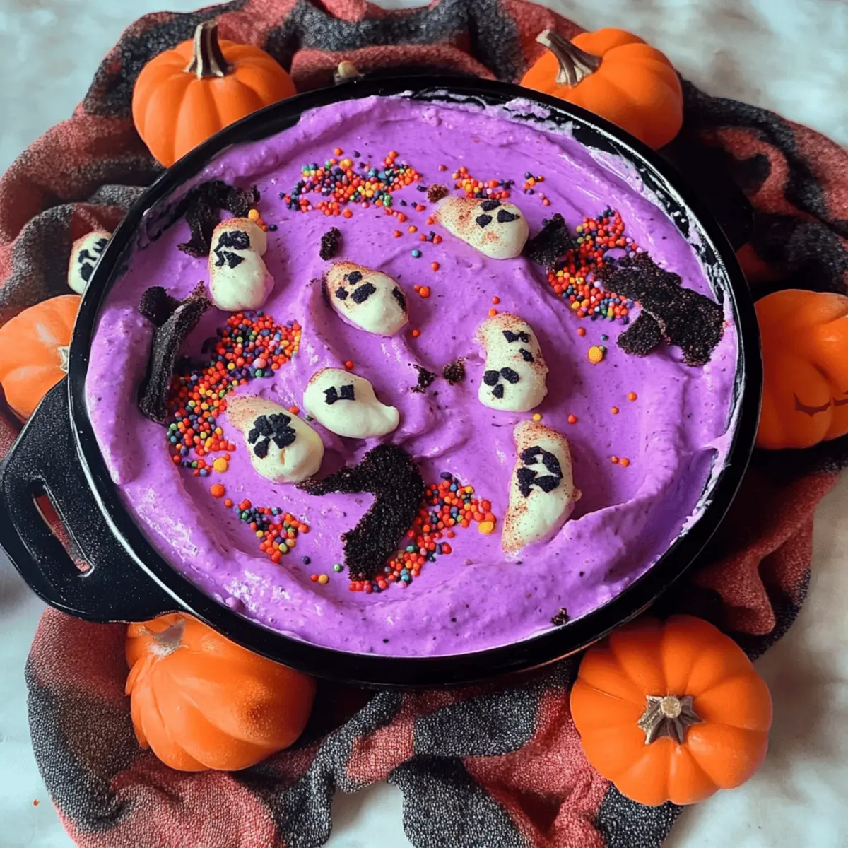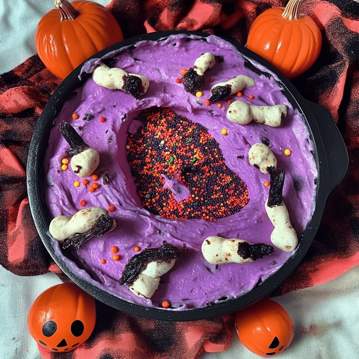- Transfer the dip into a themed serving bowl and decorate with Halloween sprinkles.